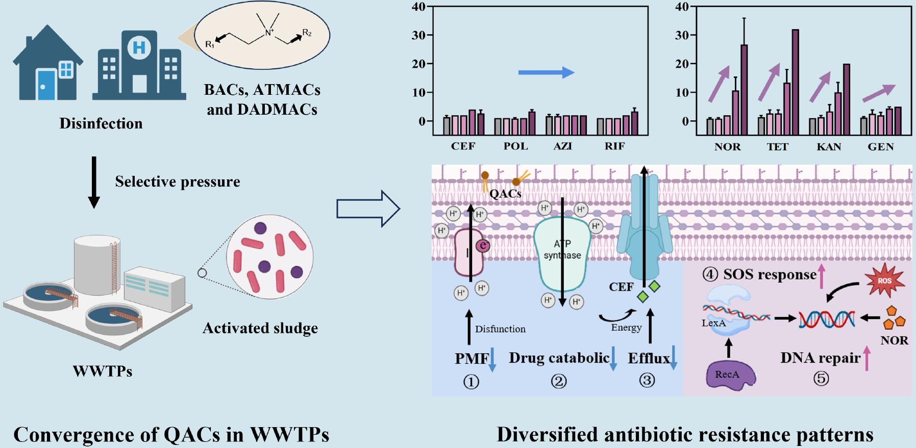 The extensive application of quaternary ammonium compounds (QACs) has led to a significant increase in their mass load in wastewater treatment plants (WWTPs). However, little is known about how QACs contribute to the emergence of resistance against different antibiotics. This study aims to reveal the structure- and dose–response relationships between various QACs and their induced antibiotic resistance and sensitivity patterns. 16 QACs were tested for their capacity in inducing multidrug resistance in activated sludge (AS) and AS-isolated E. coli. For AS, the exposure to three representative QACs resulted in up to a 32-fold increase in resistance against norfloxacin, tetracycline, kanamycin and gentamicin. However, the resistance to cefepime (CEF), azithromycin, and rifampicin remained largely unchanged. As a representative strain isolated from AS, the exposure of E. coli to QACs at 1 mg/L exhibited no induced resistance, whereas the MIC for CEF showed a decrease by 62.5%–87.5%. This was likely attributed to downregulation of proton motive force and efflux pump, which promoted the intracellular accumulation of CEF. Additionally, we identified the high-risk structural characteristics of QACs and emphasized the critical importance of determining the threshold concentrations for QACs risk management. This study provides valuable guidance for the assessment and management of environmental resistance risks caused by increased QACs in diverse environments.