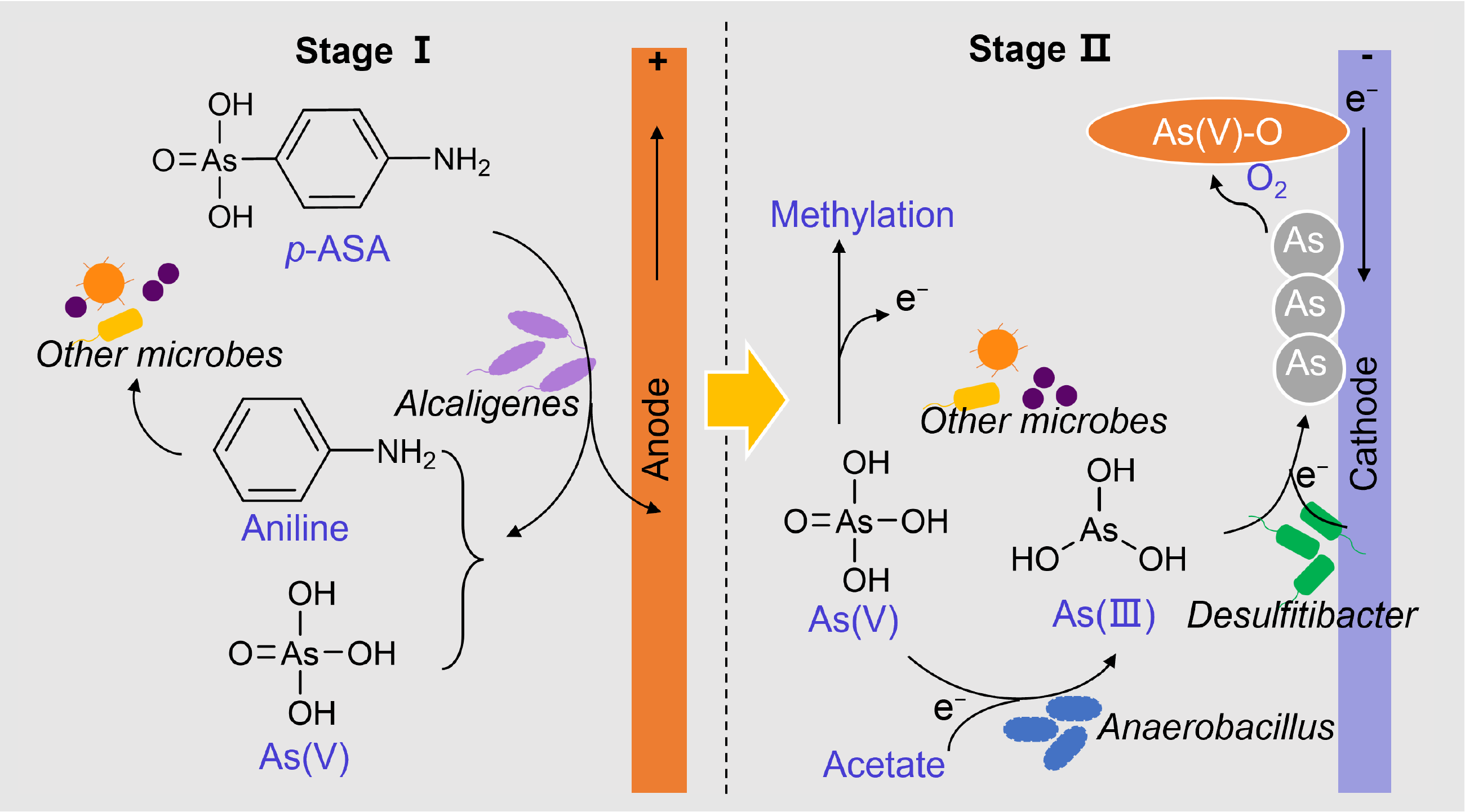 Arsanilic acid (p-ASA), an organoarsenic additive found in livestock wastewater, can release toxic inorganic arsenic into the environment. While bioelectrochemical systems have proven effective in decomposing organoarsenics, managing the resulting inorganic arsenic remains a challenge. This study demonstrated the feasibility of a two-stage bioelectrochemical process designed to facilitate p-ASA degradation and in situ recover inorganic arsenic from contaminated livestock wastewater. It consisted of two sequential stages: (I) anodic stimulation for p-ASA degradation and (II) reversing electrode polarities for the cathodic reduction of inorganic arsenic. In Stage I, the anode significantly enhanced the degradation of p-ASA, resulting in 18 μg/L of As(III) and 700 μg/L of As(V) released into the bulk solution. In Stage II, the cathode further reduced the As(III) and As(V) to 8.9 and 35.5 μg/L, respectively, through the synergistic action of the cathode and suspended microbes. The inorganic arsenic was recovered as a layer of As(V)-O on the cathode. Microbial analysis indicated that Alcaligenes was responsible for the degradation of p-ASA, while Anaerobacillus and Desulfitibacter played key roles in reducing As(V) and As(III) on the cathode, respectively. This study provided a promising alternative approach for the removal of organoarsenics and in situ recovery of inorganic arsenic from organoarsenic-bearing wastewater.