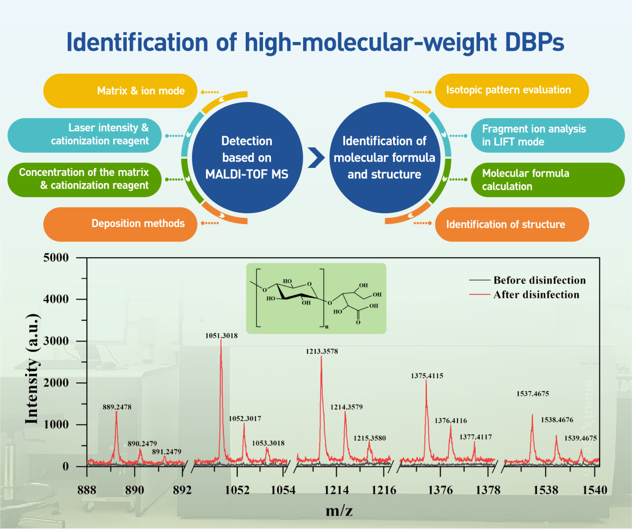High-molecular-weight disinfection byproducts (HMW DBPs) have been increasingly recognized as contaminants that pose potential hazards to human health. However, reliable analytical methods for exploring the properties and structures of these DBPs remain limited. This study presents a novel approach for detecting and identifying HMW DBPs via matrix-assisted laser desorption/ionization time-of-flight mass spectrometry. The experimental conditions were optimized by selecting super-2,5-dihydroxybenzoic acid (super-DHB) as the matrix and sodium trifluoroacetate as the cationization agent and employing the sandwich deposition method in reflection-positive ion mode with 90% laser intensity, resulting in the highest peak intensity for HMW DBPs. These optimized conditions enhanced peak reproducibility, yielding a signal-to-noise ratio of 134.9 and a coefficient of variation of 3.8%. With the new approach, five HMW DBPs were detected in simulated drinking water and identified as oligosaccharide carboxylic acids via isotopic pattern analysis, tandem mass spectrometry analysis in laser-induced dissociation mode, and database verification.
