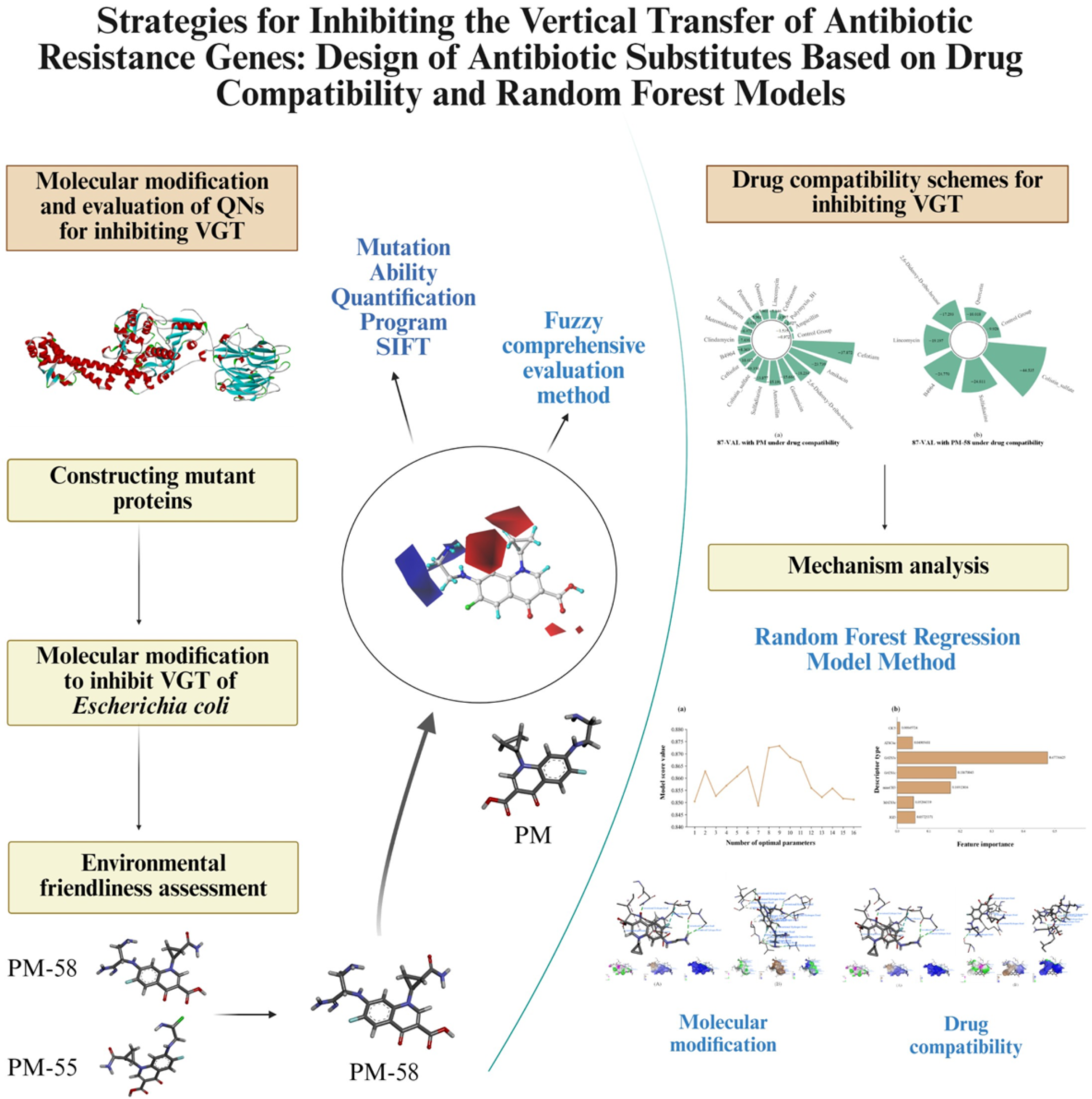 Antibiotic resistance genes (ARGs) are emerging environmental contaminants, with vertical gene transfer (VGT) in Escherichia coli (E. coli) contributing significantly to their spread. In this study, we sought to predict amino acid mutations in the DNA gyrase subunit A protein of E. coli, simulating resistance scenarios and evaluating the binding efficacy of quinolones (QNs), based on molecular docking analyses. To optimize QNs, we designed a three-dimensional quantitative structure–activity relationship model, thereby enabling the design of 153 substitutes. By screening for environmental friendliness and functional stability, we identified PM-55 and PM-58 as pharmacodynamically stable alternatives, using which the inhibition of VGT was enhanced by 65.52% and 75.86%, respectively. Furthermore, drug synergy experiments revealed that when combined with colistin sulfate E, this promoted the binding affinity of PM-58 to mutant proteins by 77.71%, mediated by an intensification of hydrophobic interactions and shorter hydrogen bonds. In addition, a machine learning-based random forest regression model was used to identify key molecular descriptors influencing drug synergy and the inhibition of ARGs, thereby providing a framework for designing sustainable antibiotic alternatives. This dual approach, which combines molecular modifications with drug synergy, offers practical solutions for mitigating the environmental dissemination of ARGs and will contribute to a more effective inhibition of antimicrobial resistance.