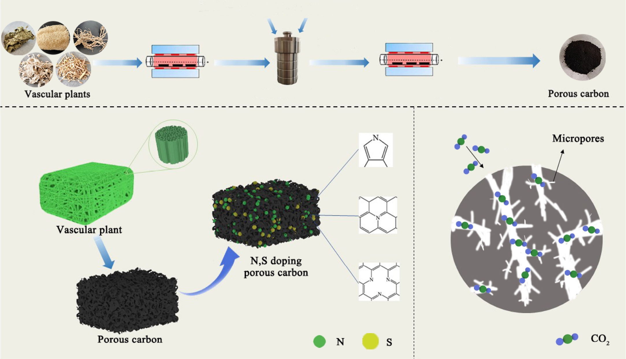 Utilization of carbon-based materials is crucial for mitigating CO2 emissions. However, practical materials for CO2 capture remain challenging due to limitations in adsorption capacity and rate. Inspired by the unique structural features of biomass materials, high-performance hierarchical porous carbon was prepared using vascular plants. The ordered arrangement structure effectively improved the adsorption capacity and rate of the material by optimizing the pore structure. Potassium hydroxide (KOH) was used as an activator to synthesize microporous carbon with an ordered hierarchical structure. The properties of hierarchical porous carbon were characterized. The experimental results indicate that porous carbon prepared from loofah complex has excellent CO2 adsorption capacity. The highest adsorption capacity is 4.09 mmol/g when the activation temperature is 700 °C. The selectivity (15/85) for the binary gas mixture CO2/N2 was 20, and the recoverability was good after 10 cycles. The hierarchical porous carbon derived from loofah showed excellent adsorption performance and has potential in various applications.