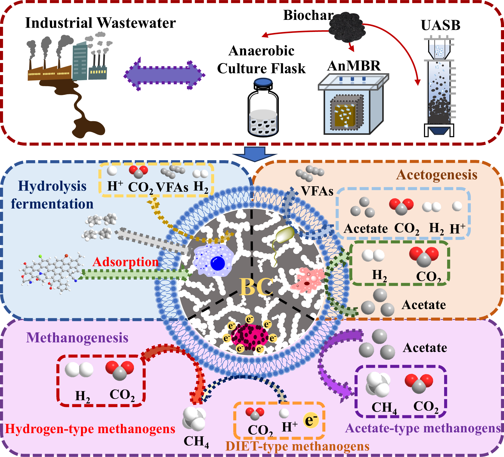 With industrialization accelerating and carbon emissions rising in recent years, the treatment of industrial wastewater containing refractory organic compounds must align with goals of energy conservation and emission reduction under the principle of carbon neutrality. Integrating anaerobic digestion (AD) with biochar (BC) presents a promising biological approach to mitigating the inhibitory effects of pollutants in wastewater treatment. By simultaneously utilizing waste biomass resources, the integration of these two sustainable biotechnologies within the biochar-anaerobic digestion (BC-AD) process not only enhances bioenergy recovery but also contributes substantially to the reduction of carbon emissions. This study addresses key challenges in the anaerobic treatment of industrial wastewater and introduces BC in terms of its functional applications, modification techniques, performance benefits, and prospects for achieving carbon neutrality. Experimental findings demonstrate that BC contributes significantly to maintaining neutral pH by regulating hydraulic retention time (HRT) and organic loading rate (OLR). The study presents a novel framework for the BC-AD process in treating industrial wastewater, emphasizing its potential to suppress refractory organics and eliminate toxic inorganics. By examining practical applications and identifying the challenges associated with large-scale implementation, this study improves the development and deployment of this integrated biotechnology. The primary objective is to encourage further investigation and industrial adoption of the BC-AD approach for low-carbon and environmentally sustainable wastewater treatment. Special emphasis is placed on the modification and application of BC to improve pollutant degradation and bioenergy recovery within AD systems, thereby underscoring its promise as an innovative solution aligned with carbon neutrality goals.
