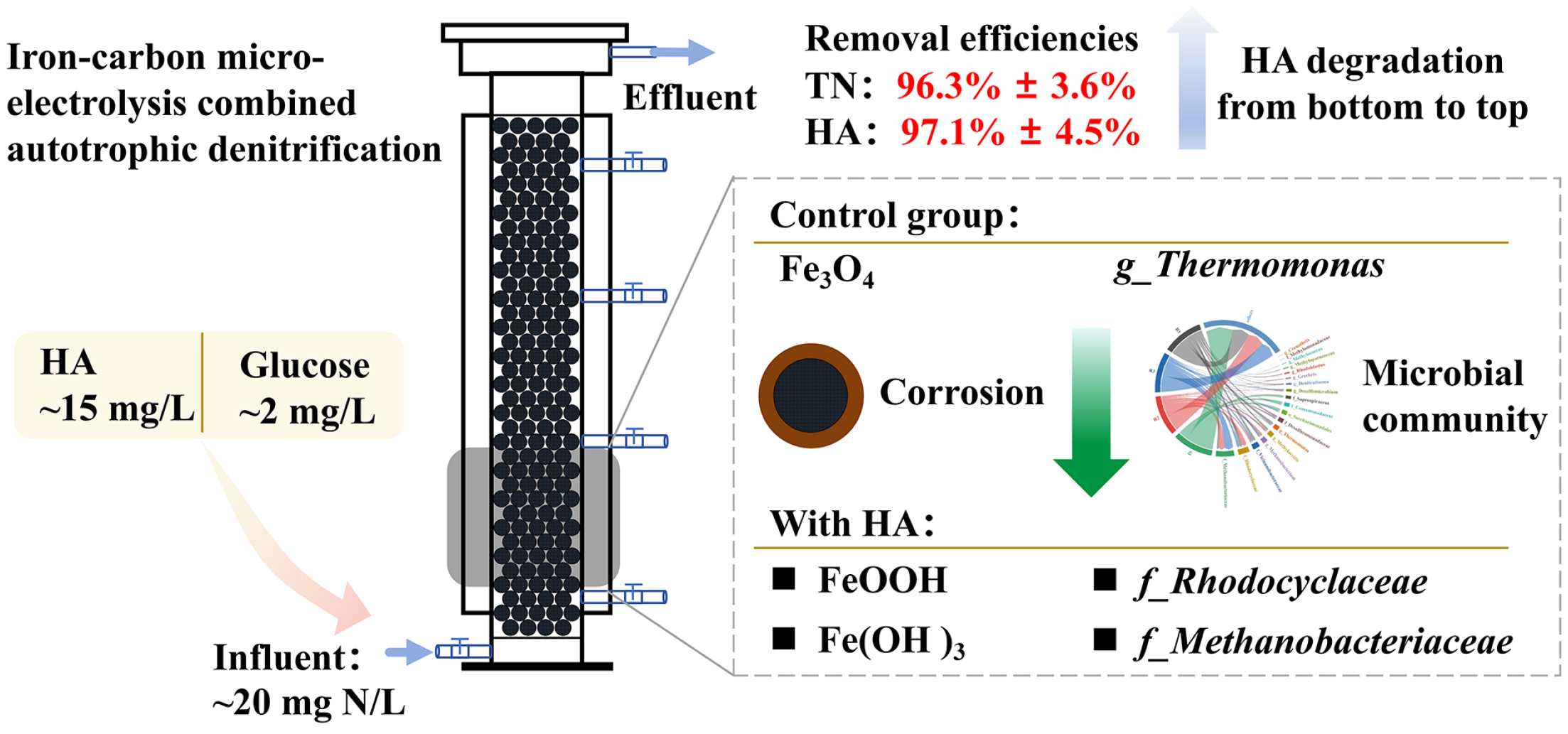 Due to increasingly stringent discharge standards for total nitrogen (TN) in wastewater treatment plant effluents and presence of residual organic pollutants (e.g., humic acid, HA, a typical refractory organic) in secondary effluents, new challenges have emerged for water reclamation. These residual organics contribute to membrane fouling in subsequent microfiltration units and serve as precursors to disinfection by-products, making the simultaneous and efficient removal of nitrate and refractory organic contaminants critical for improving reclaimed water quality. In this study, we employed iron-carbon micro-electrolysis (IC-ME) to achieve synchronous removal of nitrate and HA in a continuous-flow reactor system. The reactor was operated for 233 d, including 32 d of validation with real wastewater. With synthetic wastewater containing 20 mg/L NO3−−N and 15 mg/L HA, the system achieved 96.3% ± 3.6% TN and 97.1% ± 4.6% HA removal. During real wastewater treatment (influent: 24.1 ± 0.9 mg/L NO3−−N and 5.9 ± 0.6 mg/L HA), HA and TN removal efficiencies reached 94.6% ± 7.3% and 92.8% ± 2.9%, respectively, with effluent TN consistently below 2 mg/L. Three-dimensional fluorescence analysis confirmed that HA was effectively degraded from the reactor bottom to top. HA addition facilitated the transformation of Fe3O4 precipitates into FeO(OH) and Fe(OH)3, suggesting reduced passivation film formation. Moreover, NapA gene abundance increased and f_Rhodocyclaceae and f_Methanobacteriaceae were the dominant microbes. Thus, IC-ME is a robust technique for treating complex real wastewater, thus providing an environmentally benign solution for concurrent nitrogen and refractory organics removal in advanced wastewater treatment.