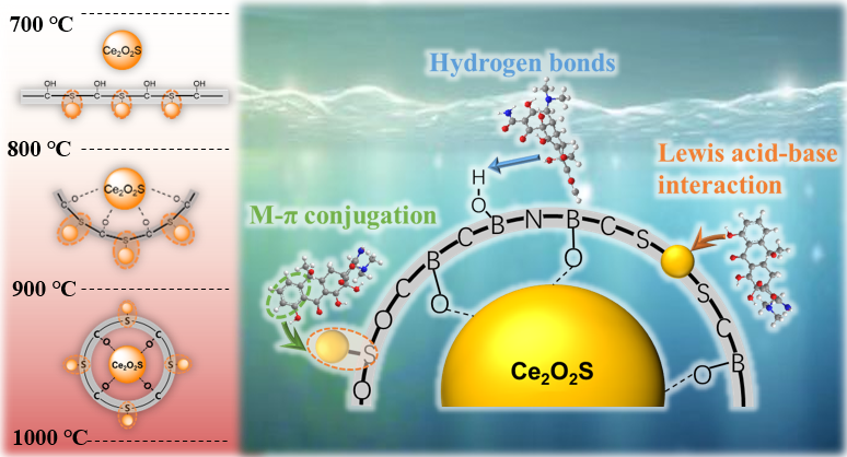 Boron carbon nitride (BCN) is a promising adsorbent for removing antibiotics in aquatic environments. However, its practical application in complex aqueous environments is limited by insufficient resistance to pH fluctuations and ion competition. In this study, a novel Ce2O2S-doped tubular boron carbon nitride adsorbent (Ce2O2S-TBCN) was synthesized via a straightforward in situ temperature-controlled self-assembly method. As the temperature increased from 700 to 1000 °C, the carbon derived from P123 improved the flexibility of BCN and facilitated sulfur retention from Ce(SO4)2, leading to the formation of Ce2O2S. During this process, interactions between B-OH groups and Ce2O2S particles induced the bending of the lamellar structure, ultimately forming a tubular morphology that increased the specific surface area by a factor of 2.8. This structural modification, combined with the incorporation of Ce2O2S, synergistically increased the adsorption capacity of Ce2O2S-TBCN by 58.9% compared to pristine BCN. The adsorption kinetics of tetracycline by Ce2O2S-TBCN followed a pseudo-second-order kinetic model. Isotherm analysis revealed a transition from multilayer to monolayer adsorption as the adsorbent dose increased. The spontaneous and exothermic adsorption process was verified by thermodynamic analysis. Moreover, Ce2O2S-TBCN demonstrated remarkable stability under ion coexistence conditions and across a wide pH range, with its performance declining by only 2.4% after 10 cycles. This exceptional stability was attributed to multiple adsorption forces, including hydrogen bonding, Lewis acid-base interactions, and M-π complexation. Ce2O2S-TBCN with high adsorption capacity and resistance to interference holds great potential for application in complex aquatic environments.