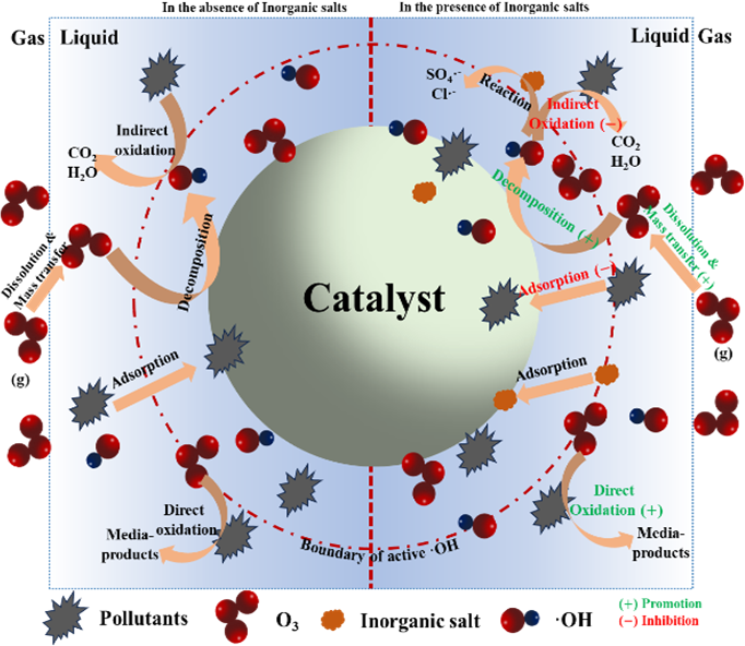 The presence of inorganic salts poses a significant challenge to the effective removal of petrochemical wastewater during the catalytic ozonation. However, the mechanism by which inorganic salts influence the catalytic ozonation of actual wastewater remains unclear and controversial. This study investigated the effects of inorganic salts (Na2SO4 and NaCl) on the catalytic ozonation of petrochemical wastewater. The TOC removal rate decreased from 59.89% to 32.12%–35.80% as Na2SO4 concentration increased from 0 to 5–10 g/L, whereas increasing NaCl had a slight impact on the TOC removal efficiency. Similar trends were observed for the removal of UV254 and fluorescent organic substances. This is attributed to the superior ozone mass transfer enhancement and ·OH generation, as well as weaker inhibition of the adsorption process exhibited by NaCl compared to Na2SO4. Enhanced ozone mass transfer and elevated ozone concentrations promote direct oxidation by ozone molecules, reducing both the content and proportion of macro-molecule (molecular weight > 3 kDa) matters in the effluent. Conversely, weakened adsorption impedes the mineralization of micro-molecule (molecular weight < 3 kDa) fractions, leading to an increase in their content and proportion in the effluent. Our findings demonstrate that inorganic salts influence catalytic ozonation through a complex interplay of enhanced ozone supply, stronger direct oxidation, higher radical production, and hindered pollutant adsorption. These insights may guide future process optimization and catalyst design to improve the catalytic ozonation of saline petrochemical wastewater.