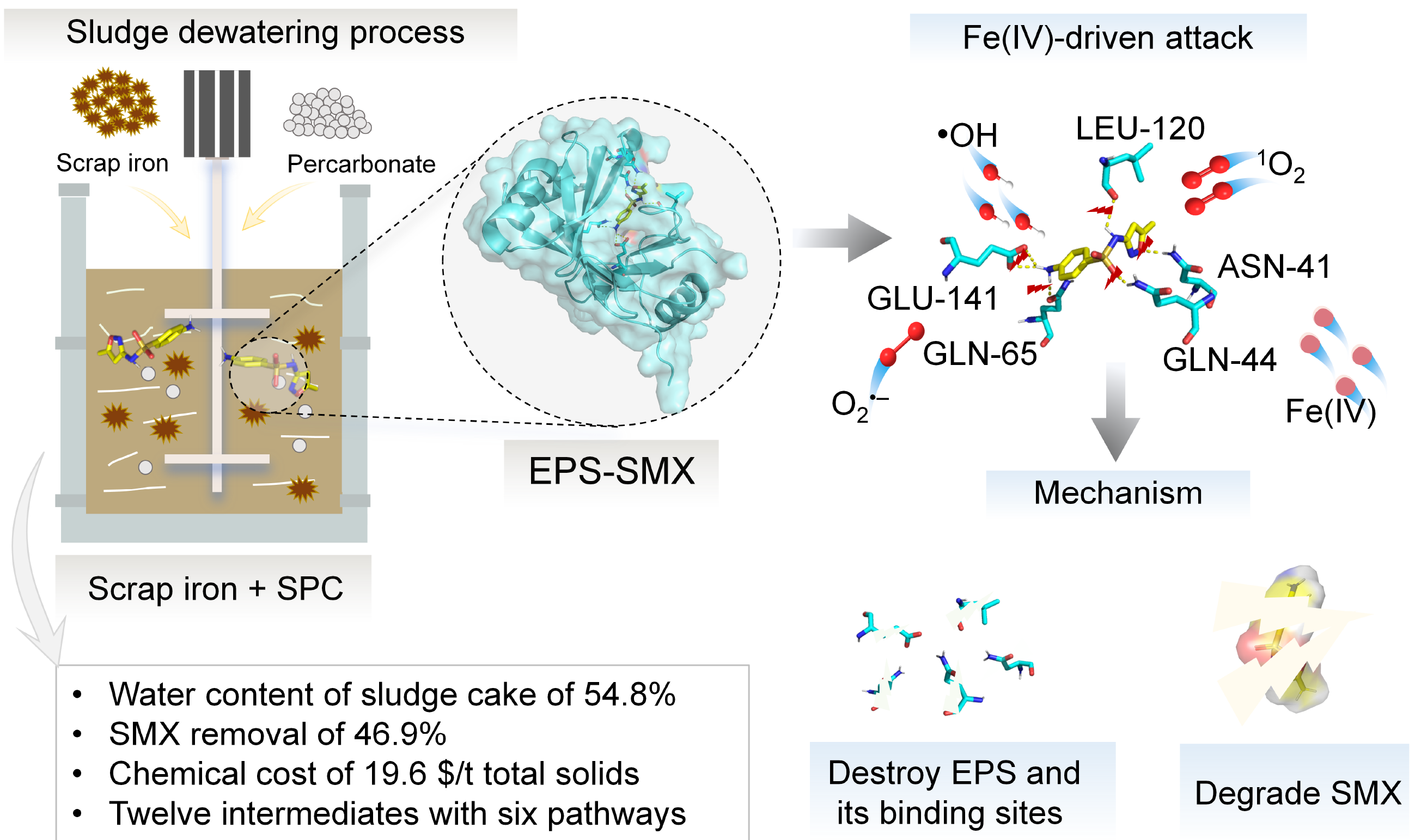 Removal of sulfonamides during the dewatering of sludge is critical to lighten the burden on downstream treatment processes such as anaerobic digestion. However, to this end, the preferred peroxide-based advanced oxidation processes are inadequate due to their insufficient oxidation efficiency, resulting in low removal of sulfonamides. The present study introduced a novel sludge dewatering approach, involving scrap iron combined with percarbonate (SPC) to produce high-valent iron for the removal of sulfonamide, with a focus on sulfamethoxazole (SMX) as the representative sulfonamide compound. Under optimized conditions, the treatment involving the combination of scrap iron and SPC resulted in a water content of 54.8% ± 0.3% and removed 46.9% ± 0.5% of SMX at a chemical cost of 19.6 $/t of total solids, demonstrating competitiveness to contemporary peroxides-based advanced oxidation processes. High-valent iron effectively broke down the key binding compounds and sites between extracellular polymeric substances (EPS) and SMX, leading to a shift towards hydrophobic bonding sites, smaller and more dispersed particle configurations, and reduced capacity for retaining water. This facilitated the release of SMX into liquid phases, followed by degradation by reactive oxygen species. These findings collectively demonstrate that the proposed method of using scrap iron in conjunction with SPC can remarkably reduce the volume of sludge and enhance the removal of SMX during the dewatering of sludge.
