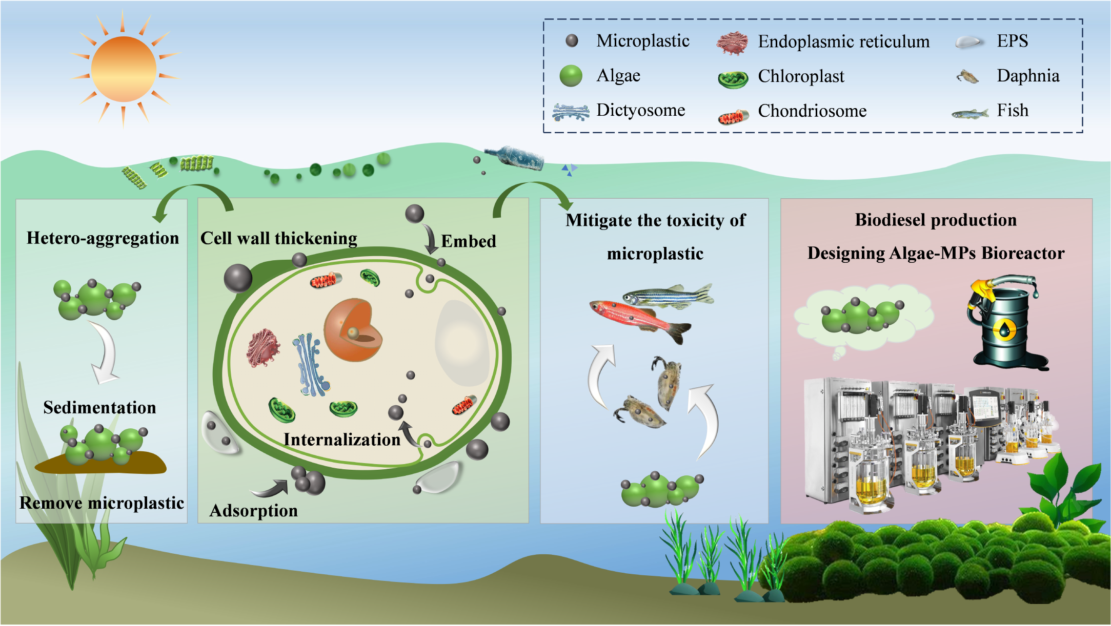 Microplastics (MPs) represent a new class of pollutants that are widely distributed and significantly affect aquatic ecosystems. Until now, an expanding circle of studies has focused on the environmental behavior and effects of MPs. However, the strategies and technologies for effectively addressing and mitigating MPs pollution remain unexplored. As primary producers, algae play a crucial role in aquatic ecosystems and inevitably interact with MPs, positioning them at the forefront of MPs pollution. This review provides a comprehensive analysis of algal-MP interactions, the effects of MPs on algae, the resulting environmental behaviors, and the underlying mechanisms. Importantly, by analyzing the ability and mechanisms of algal-MP interactions, we highlight promising applications of using the environmental adaptability and biological properties of algae for mitigating aquatic plastic pollution, including mitigation of MPs toxicity, removal of MPs, and repurposing of aquatic plastic particles. Additionally, by discussing these applications leveraging the algal-MP interaction, this review enables future research and technology development of eco-friendly and cost-effective approaches that are crucial for global efforts to mitigate plastic pollution.