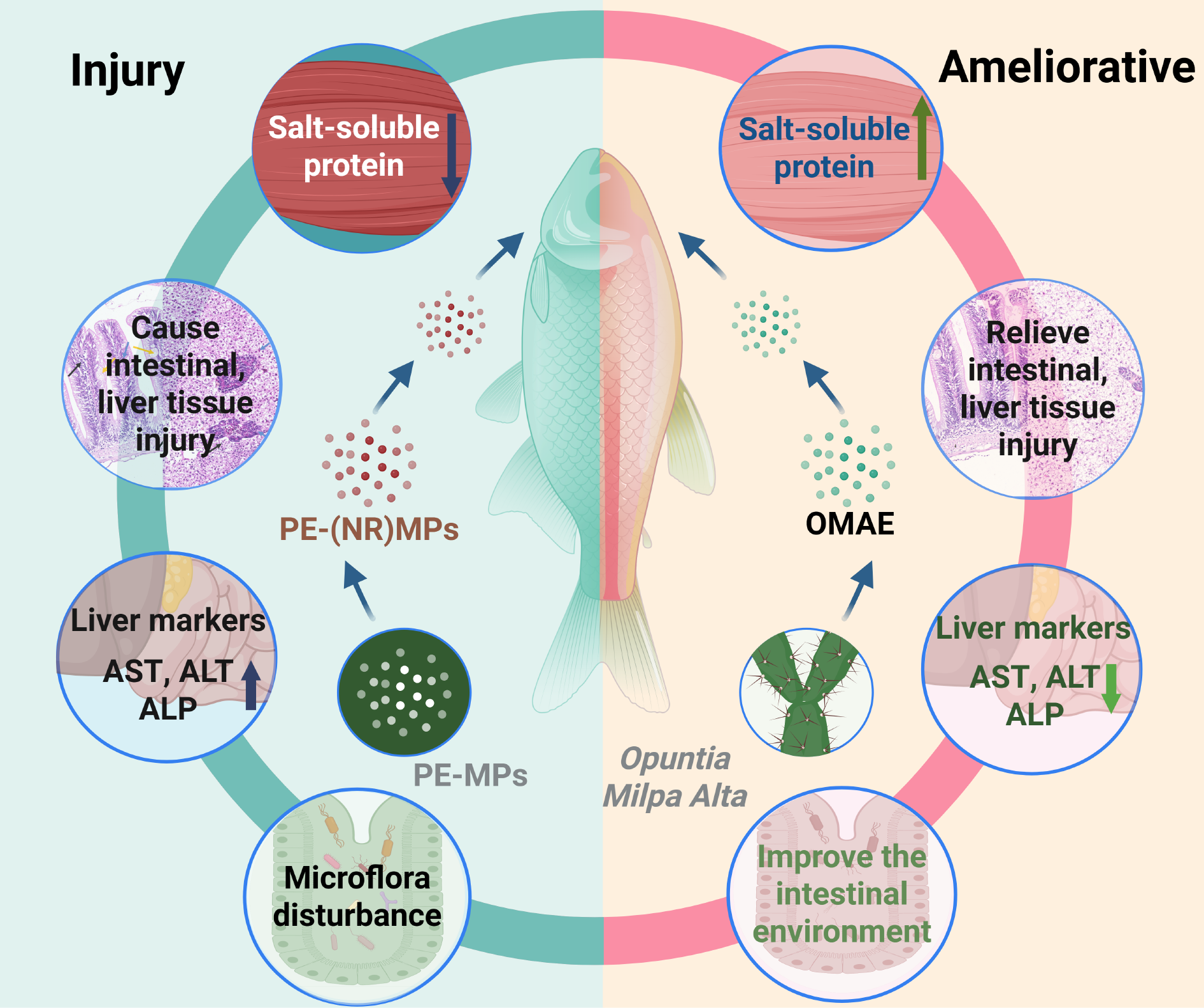 In recent years, the pollution of microplastics (MPs) in water ecosystems has gained much attention. Polyethylene microplastics (PE-MPs) are stable and can accumulate in organisms, causing harm to fish and other aquatic life. This study used juvenile carp to examine the toxic effects of PE-MPs and the potential benefits of Opuntia Milpa alta extract. We optimized fluorescence labeling to prepare 30 μm PE-MPs and analyzed their distribution in juvenile carp. The results showed that they mainly accumulate in the liver and intestines, with some in the kidneys and gills. A 45-d exposure study revealed that PE-MPs caused liver cell damage, inflammation, and increased liver function biomarkers (AST, ALT, ALP) (P < 0.05). There was also a decrease in gut microbiota diversity and an increase in harmful bacteria like Desulfovibrionaceae. The intervention with Opuntia Milpa alta extract (0.50%, 1.00%, 2.00% in feed) significantly reduced AST and ALT levels (P < 0.05), improved liver health, and restored gut microbiota diversity. Analysis of the extract showed it contains bioactive substances like polysaccharides (23.15%) and alkaloids (55.96%). These components likely enhance liver function and balance gut health by modulating the gut-liver connection. This study offers new insights into ecotoxicological measures for microplastic pollution and suggests that natural plant extracts can help protect environmental health.