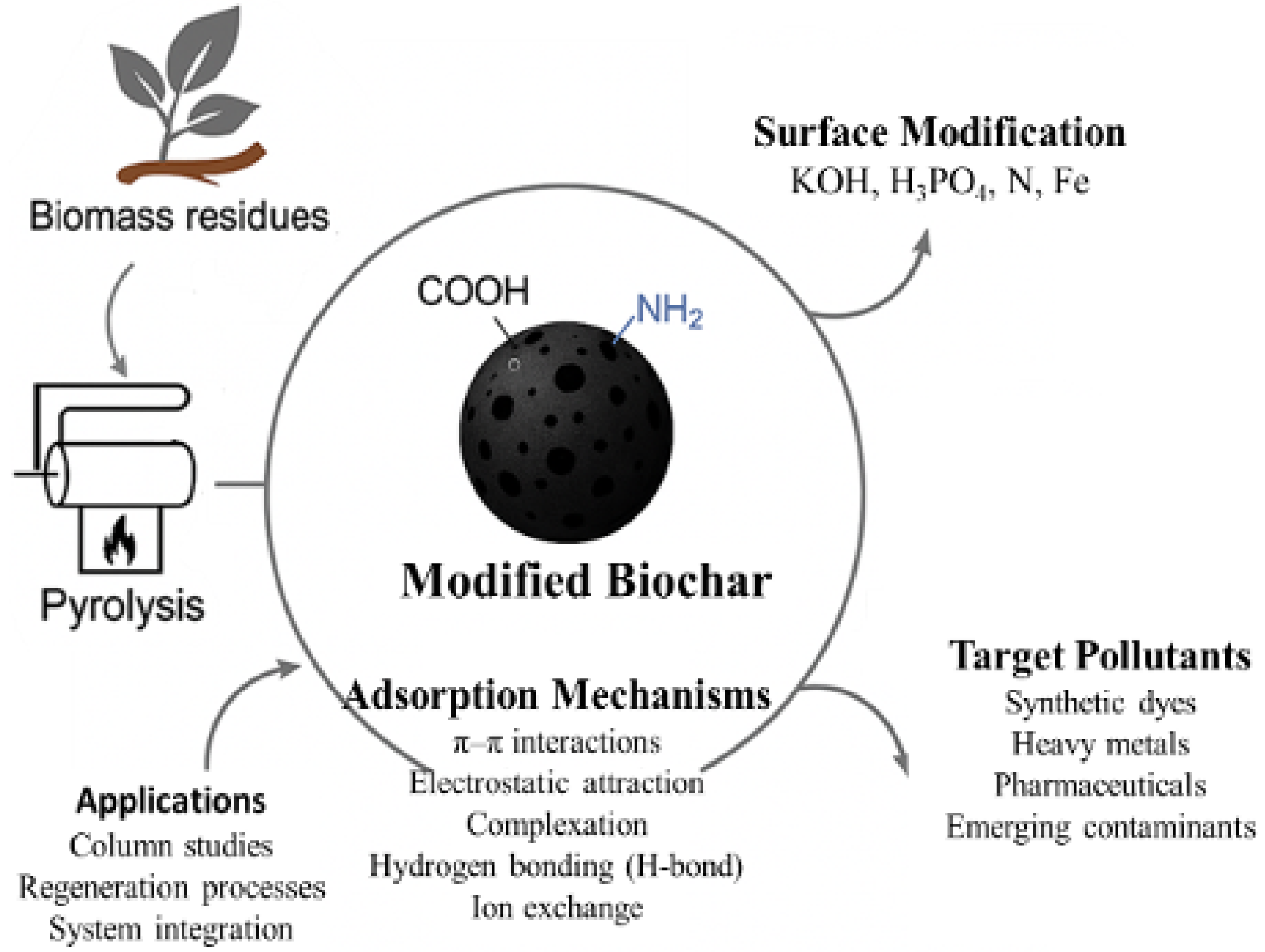 Biochar has emerged as a sustainable and cost-effective adsorbent for the removal of emerging contaminants from wastewater. This review critically explores recent advances in the design and application of engineered biochars derived from diverse waste biomasses, focusing on the link between structural modifications and pollutant-specific removal mechanisms. Functionalization strategies including physical and chemical activation, heteroatom doping, surface grafting, and hybrid composite formation are systematically analyzed for their impact on adsorption efficiency and selectivity toward dyes, heavy metals, pharmaceuticals, and per- and polyfluoroalkyl substances. Particular attention is paid to performance in column systems, regeneration potential, and behaviour in complex real-world matrices, which remain underexplored in current literature. The diversity of adsorption mechanisms such as electrostatic interactions, π–π stacking, hydrogen bonding, ion exchange, and surface complexation is discussed in relation to surface chemistry and pollutant type. Despite promising results, critical challenges persist, including biochar heterogeneity, lack of standard production protocols, potential leaching of dopants, and limitations in large-scale implementation. This review highlights the need for unified assessment frameworks, life cycle analyses, and integration strategies aligned with circular economy principles. By bridging the gap between laboratory innovation and field-scale application, this work provides a comprehensive roadmap for researchers, engineers, and stakeholders seeking to deploy next-generation biochar-based sorbents in sustainable water treatment systems.