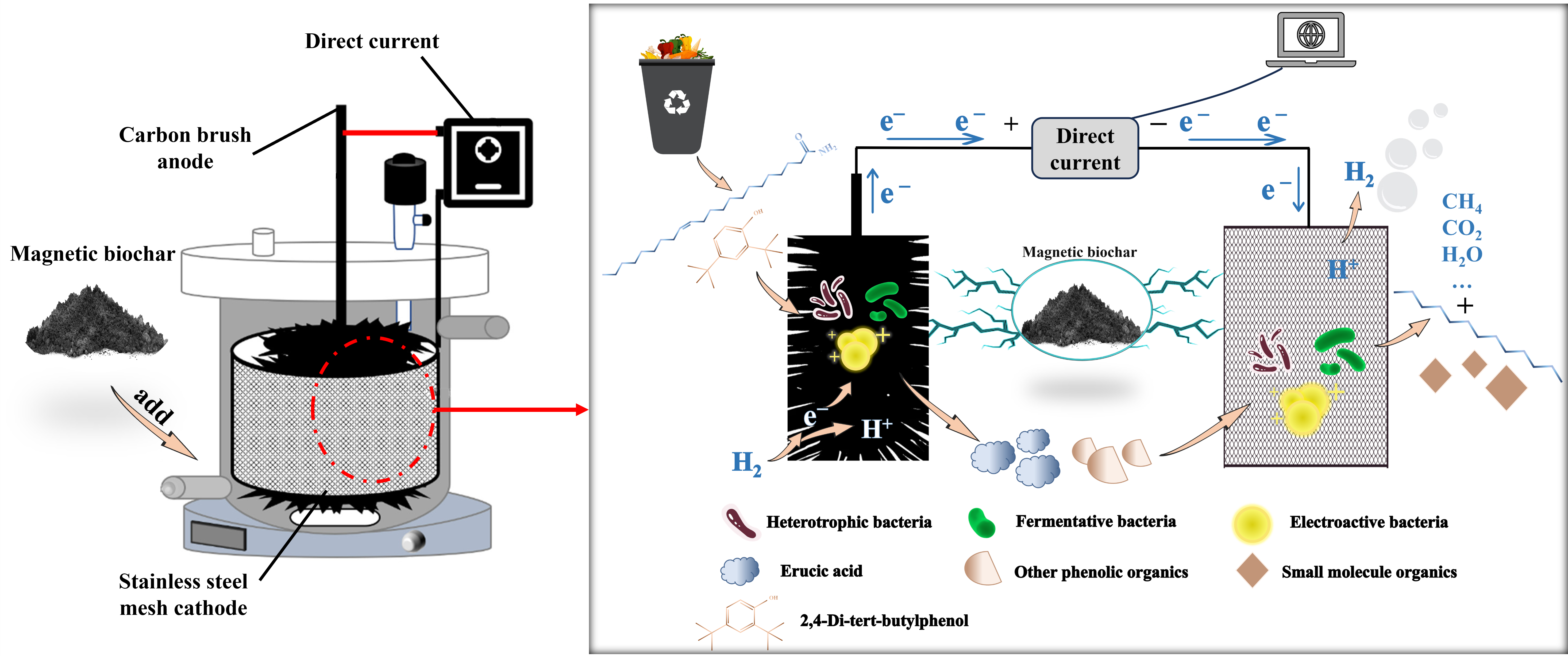 Landfill leachate has a highly complex composition containing hazardous substances and refractory organic compounds, which makes its treatment challenging. In this study, a microbial electrolysis cell coupled anaerobic digestion (MEC-AD) system was constructed and integrated with magnetic biochar (MBC). The critical parameters (i.e., applied voltage, anode-to-cathode area ratio, and cathode mesh size) were systematically optimized through orthogonal experiments to investigate their impacts on chemical oxygen demand (COD), organic transformation pathways, and microbial community succession in the system. The results demonstrated a maximum COD removal efficiency of 59.7%. The optimal combination of parameters included an applied voltage of 1.2 V, an anode-to-cathode area ratio of 1:0.5, and a cathode mesh size of 200 mesh. Furthermore, spectral analysis revealed significant degradation of aromatic compounds with conjugated double bonds and humic acid-like substances, which indicated that electrochemical stimulation effectively facilitated molecular chain cleavage and enhanced microbial metabolism. Long-chain amides (such as 13-Docosenamide, (Z)-) were hydrolyzed into fatty acids and further transformed into alkanes. On the other hand, aromatic pollutants like 2,4-Di-tert-butylphenol underwent progressive mineralization through hydroxylation and ring-opening reactions. Under applied voltage of 1 V, electroactive bacteria (i.e., Comamonas (22.3%) and Pseudomonas (8.1%)) in anode biofilms formed metabolic networks with fermentative bacteria (Soehngenia) and synergistically enhanced electron transfer and organic reduction with heterotrophic bacteria at the cathode. This research provides theoretical insights into optimized degradation mechanisms of MEC-AD systems and the practical feasibility of its application for landfill leachate treatment.