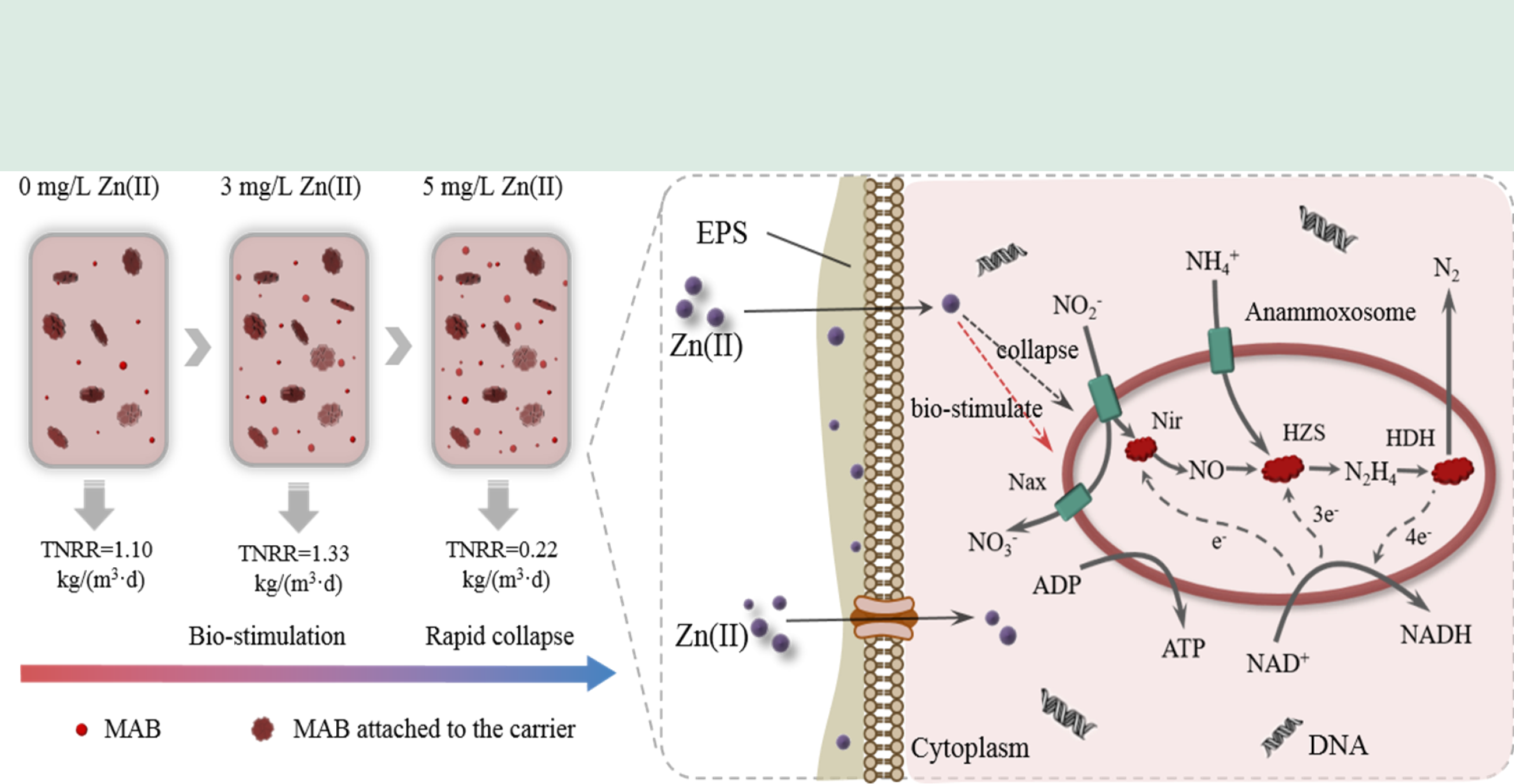 This work first unraveled the response mechanism of marine anammox bacteria (MAB)-dominated anammox process to Zn(II) in treating saline wastewater. Low Zn(II) doses (≤ 3 mg/L) enhanced MAB activity, with the highest total nitrogen removal rate (TNRR) of 1.33 kg/(m3·d) achieved at 3 mg/L Zn(II). Additionally, the relative abundance of MAB (Candidatus Scalindua) sharply increased from 9.2% to 46.1%. It further increased to 53.0% at 5 mg/L Zn(II), even though TNRR collapsed to 0.22 kg/(m3·d). Furthermore, the production of nitrite reductase, nitrate reductase and hydrazine dehydrogenase was stimulated, with enzymatic activity and heme c content first increasing and then decreasing, reaching the maximum at 3 mg/L Zn(II). More extracellular polymeric substances were also secreted to resist high Zn(II) doses (≥ 4 mg/L) stress. This work clearly demonstrated that the addition of appropriate doses of Zn(II) is an effective strategy to stimulate MAB activity in the treatment of saline wastewater.