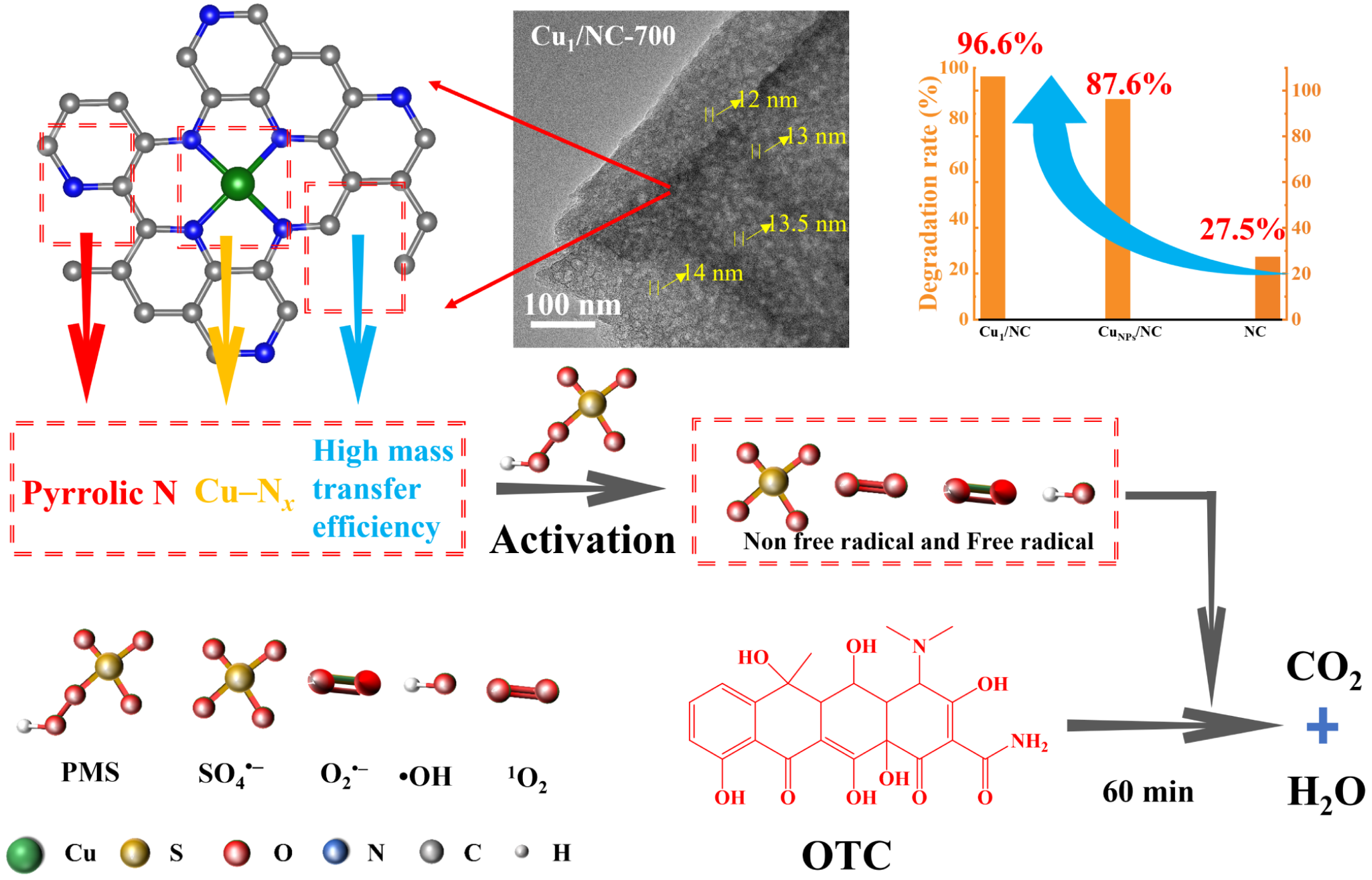 Atomically dispersed metal catalysts (ADMCs) with dual reaction sites have been extensively utilized in permonosulfate (PMS)-based Fenton-like systems for the degradation of antibiotic wastewater, yet challenges remain in synthesizing cost-effective and highly active Cu-based catalysts. Herein, atomically dispersed Cu catalysts supported on N-doped cellulose-derived carbon (Cu1/NC-700) are synthesized via a sol-gel combined with high-temperature pyrolysis method. The formed Cu−Nx and pyrrolic N dual reaction sites enhance the activation of PMS and adsorption of oxytetracycline (OTC), thereby shortening the migration distance of radicals towards the OTC. Moreover, graphitic N accelerates electron transfer to facilitate the Cu2+/Cu+ cycle for the generation of highly efficient active species, including •OH, 1O2, SO4•−, and O2•−. The Cu1/NC-700 exhibits significant catalytic activity for the degradation of OTC, achieving 96.6% degradation efficiency within 60 min at an initial substrate concentration of 50 mg/L, a high turnover frequency (0.279/min) and apparent rate constant (0.0827/min), which markedly surpassed those of Cu1/NC-600, Cu1/NC-800, and CuNPs/NC. The results of chemical quenching experiments, electron paramagnetic resonance, and electrochemical analysis show that 1O2-dominated non-radical pathway is the main mechanism rather than the radical pathway in the Cu1/NC-700+PMS+OTC system. This work presents a straightforward and cost-effective strategy for the synthesis of ADMCs for the treatment of tetracyclines wastewater.