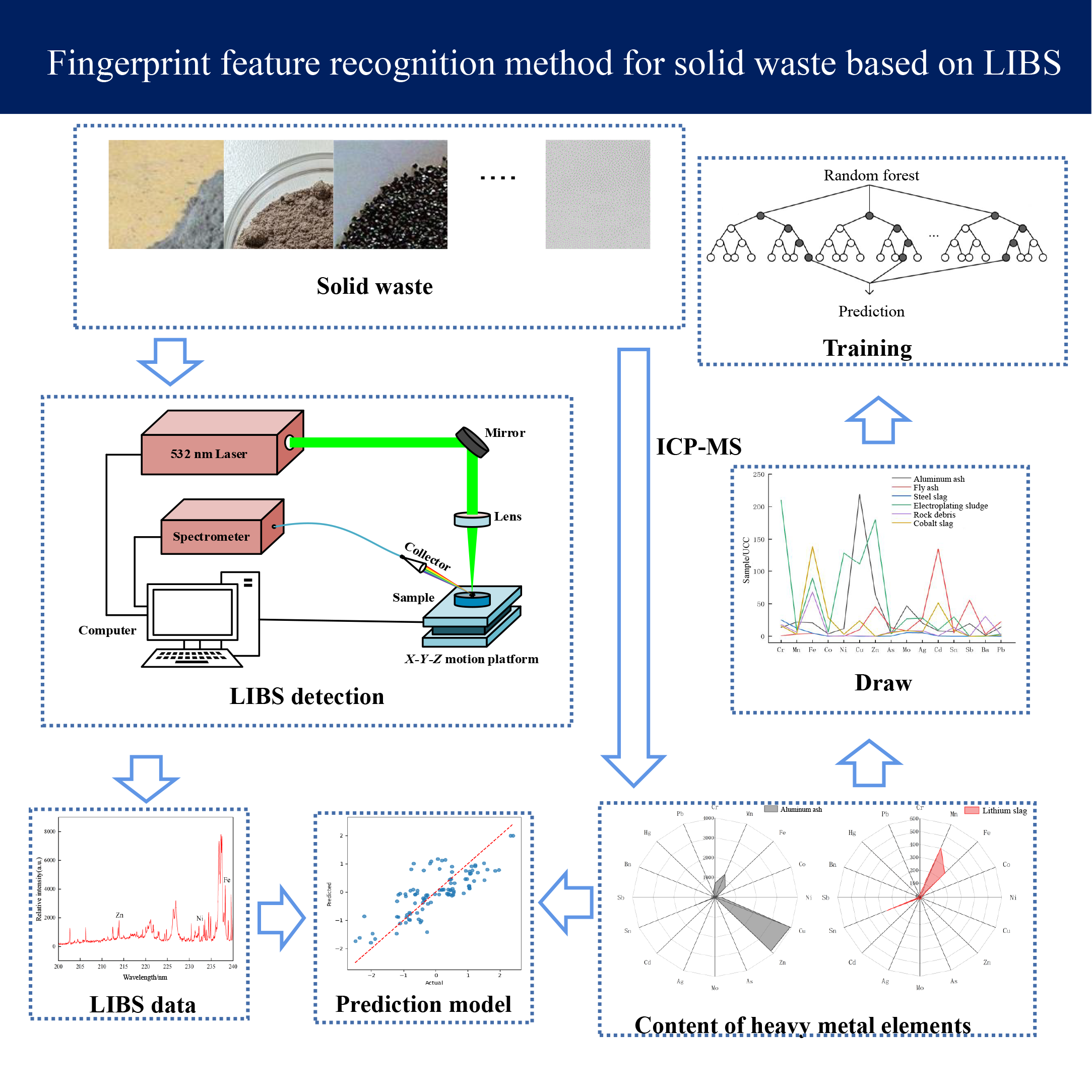 The foundation of solid waste resource utilization and disposal lies in identifying the types and characteristics of solid waste. However, owing to the complexity and mixed storage of solid waste types, classification is difficult, which hinders the development of solid waste recycling and a circular economy. This study, which was based on laser-induced breakdown spectroscopy (LIBS), carried out rapid quantitative detection of 16 heavy metal elements. By using the Kruskal-Wallis H test method, heavy metal element fingerprint factors were selected, and characteristic distribution curves of heavy metal elements in different solid wastes were plotted to construct classification and identification models. The study revealed that the random forest model achieved the highest classification accuracy of 96.8%. Finally, LIBS was used to detect the elemental content in actual samples, and when combined with the model, the classification accuracy reached a maximum of 74.2%. This paper provides a method for identifying solid waste fingerprint features and a recognition model based on fingerprint features for the rapid identification of unknown solid waste, laying the foundation for waste property recognition and resource recovery.