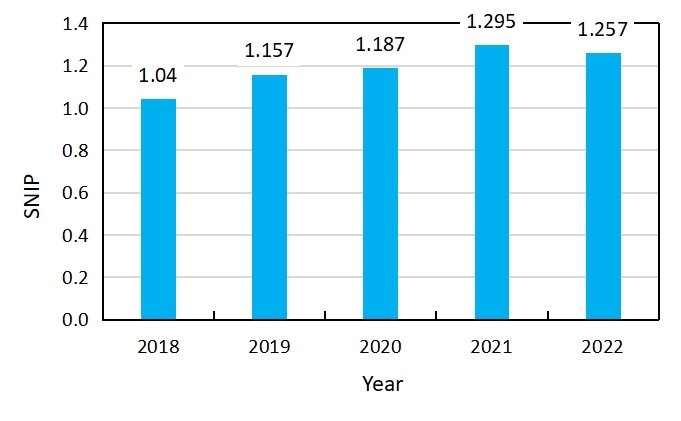 SNIP measures the average citation impact of the publications of a journal. It takes into account characteristics of the source's subject field, which is the set of documents citing that source. It is the ratio of a source's average citation count per paper and the citation potential of its subject field.