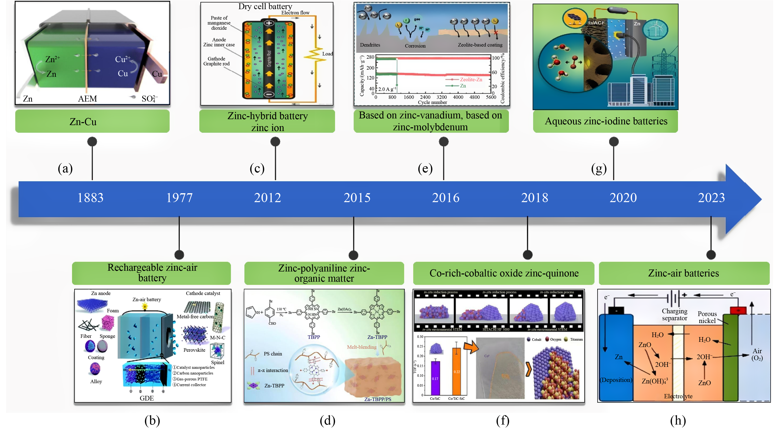 As illustrated in Fig.1, Zn-based battery technology has evolved significantly since the introduction of the Zn-copper battery in 1883 [12], marking one of the earliest developments in this field. Subsequent innovations, including Zn-air [13], Zn-bromine hybrid [14], and zinc-iodine batteries [18], have substantially advanced the technology. The incorporation of iodine as a positive active material enables reversible redox reactions at the Zn anode, offering high theoretical energy density and potential applications in distributed energy storage systems. Most recently, the 2023 development of self-decoupled mild-acidic Zn-air battery [19] has further expanded the potential of Zn-based battery technologies.