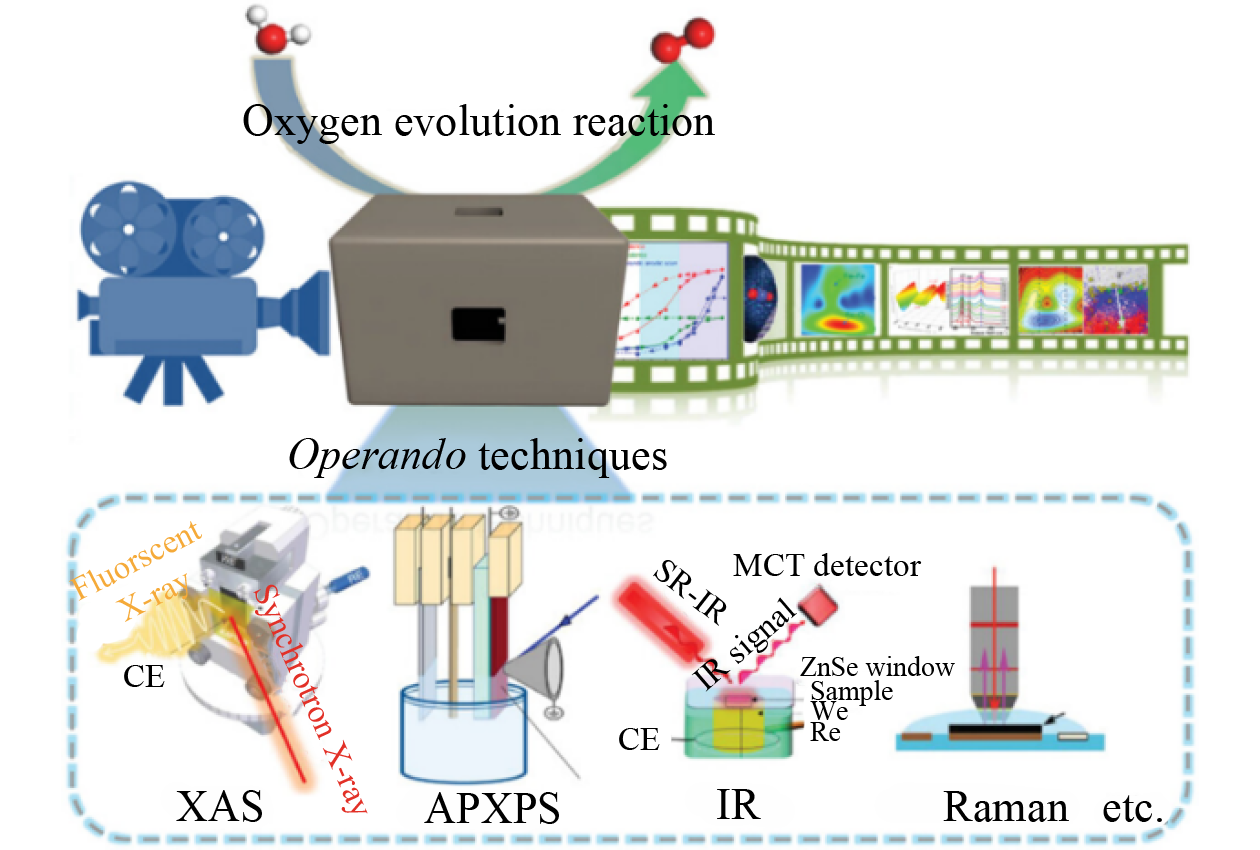 operando Fourier-transform infrared (FTIR) spectroscopy, Raman spectroscopy, and X-ray absorption spectroscopy (XAS), as shown in Fig. 1, which provide atomic-level insights into coordination geometry alterations and oxidation state dynamics under anodic polarization [