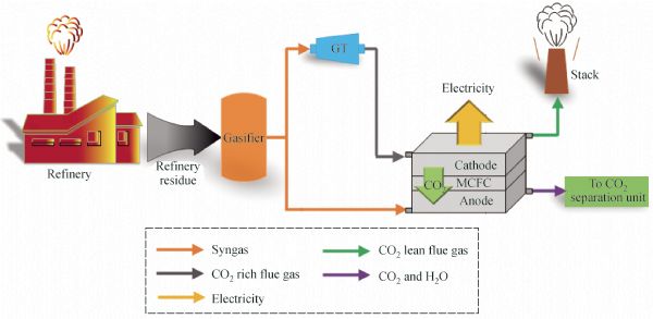 The aim of this paper is to investigate the implementation of a molten carbonate fuel cell (MCFC) as a CO2 separator. By applying multi-objective optimization (MOO) using the genetic algorithm, the optimal values of operating load and the corresponding values of objective functions are obtained. Objective functions are minimization of the cost of electricity (COE) and minimization of CO2 emission rate. CO2 tax that is accounted as the pollution-related cost, transforming the environmental objective to the cost function. The results show that the MCFC stack which is fed by the syngas and gas turbine exhaust, not only reduces CO2 emission rate, but also produces electricity and reduces environmental cost of the system.