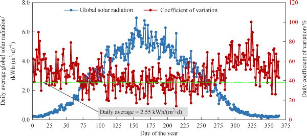 Globally, solar energy is expected to play a significant role in the changing face of energy economies in the near future. However, the variability of this resource has been the main barrier for solar energy development in most locations around the world. This paper investigated the distribution and variability of solar radiation using the a 10-year (2006 to 2015) data collected at Sørås meteorological station located at latitude 59° 39′ N and longitude 10° 47′E, about 93.3 m above sea level (about 30 km from Oslo), in south-eastern part of Norway. It is found that on annual basis, the total number of days with a global solar radiation of less than 1 kWh/(m2·d) is 120 days while the total number of days with an expected global solar radiation greater than 3 kWh/(m2·d) is 156 days (42.74%) per year. The potential energy output from a horizontally placed solar collector in these 156 days is approximately 75% of the estimated annual energy output. In addition, it is found that the inter-annual coefficient of variation of the global solar radiation is 4.28%, while that of diffuse radiation is 4.96%.