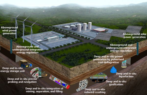 Mining industries worldwide have inevitably resorted to exploiting resources from the deep underground. However, traditional mining methods can cause various problems, e.g., considerable mining difficulty, environmental degradations, and frequent disastrous accidents. To exploit deep resources in the future, the concept of mining must be reconsidered and innovative new theories, methods, and technologies must be applied. To effectively acquire coal resources deeper than 2000 m, new theoretical and technological concepts about deep in situ fluidized mining are required. The limits of mining depth need to be broken to acquire deep-coal resources in an environmentally friendly, safe, and efficient manner. This is characterized by ‘There are no coal on the ground and no men in the coal mine’. First, this paper systematically explains deep in situ fluidized coal mining. Then, it presents a new theoretical concept, including the theories of mining-induced rock mechanics, three-field visualization, multi-physics coupling for in situ transformation, and in situ mining, transformation and transport. It also presents key technological concepts, including those of intelligent, unmanned, and fluidized mining. Finally, this paper presents a strategic roadmap for deep in situ fluidized coal mining. In summary, this paper develops new theoretical and technological systems for accomplishing groundbreaking innovations in mining technologies of coal resources in the deep underground.