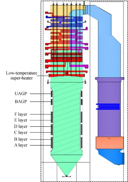 Industrial-scale experiments were conducted to study the effects of tertiary air declination angle (TDA) on the coal combustion and steam temperature characteristics in the first 350-MW supercritical down-fired boiler in China with the multiple-injection and multiple-staging combustion (MIMSC) technology at medium and high loads. The experimental results indicated that as the TDA increased from 0° to 15°, the overall gas temperature in the lower furnace rose and the symmetry of temperature field was enhanced. The ignition distance of the fuel-rich coal/air flow decreased. In near-burner region, the concentration of O2 decreased while the concentrations of CO and NO increased. The concentration of NO decreased in near-tertiary-air region. The carbon in fly ash decreased significantly from 8.40% to 6.45% at a load of 260 MW. At a TDA of 15°, the ignition distances were the shortest (2.07 m and 1.73 m) at a load of 210 MW and 260 MW, respectively. The main and reheat steam temperatures were the highest (557.2°C and 559.4°C at a load of 210 MW, 558.4°C and 560.3°C at a load of 260 MW). The carbon in fly ash was the lowest (4.83%) at a load of 210 MW. On changing the TDA from 15° to 25°, the flame kernel was found to move downward and the main and reheat steam temperatures dropped obviously. The change of TDA has little effect on NOx emissions(660–681 mg/m3 at 6% O2). In comprehensive consideration of the pulverized coal combustion characteristics and the unit economic performance, an optimal TDA of 15° is recommended.