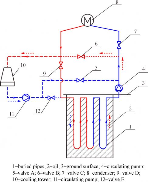 This paper aims to explore an efficient, cost-effective, and water-saving seasonal cold energy storage technique based on borehole heat exchangers to cool the condenser water in a 10 MW solar thermal power plant. The proposed seasonal cooling mechanism is designed for the areas under typical weather conditions to utilize the low ambient temperature during the winter season and to store cold energy. The main objective of this paper is to utilize the storage unit in the peak summer months to cool the condenser water and to replace the dry cooling system. Using the simulation platform transient system simulation program (TRNSYS), the borehole thermal energy storage (BTES) system model has been developed and the dynamic capacity of the system in the charging and discharging mode of cold energy for one-year operation is studied. The typical meteorological year (TMY) data of Dunhuang, Gansu province, in north-western China, is utilized to determine the lowest ambient temperature and operation time of the system to store cold energy. The proposed seasonal cooling system is capable of enhancing the efficiency of a solar thermal power plant up to 1.54% and 2.74% in comparison with the water-cooled condenser system and air-cooled condenser system respectively. The techno-economic assessment of the proposed technique also supports its integration with the condenser unit in the solar thermal power plant. This technique has also a great potential to save the water in desert areas.