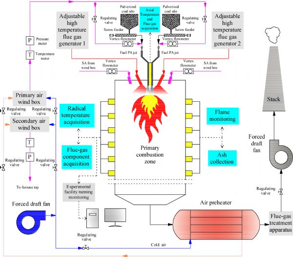 To improve the ignition behavior and to reduce the high NOx emissions of blended pulverized fuels (PF) of semicoke (SC), large-scale experiments were conducted in a 300 kW fired furnace at various nozzle settings, i.e., ratios (denoted by hf/b) of the height of the rectangular burner nozzle to its width of 1.65, 2.32, and 3.22. The combustion tests indicate that the flame stability, ignition performance, and fuel burnout ratio were significantly improved at a nozzle setting of hf/b = 2.32. The smaller hf/b delayed ignition and caused the flame to concentrate excessively on the axis of the furnace, while the larger hf/b easily caused the deflection of the pulverized coal flame, and a high-temperature flame zone emerged close to the furnace wall. NOx emissions at the outlet of the primary zone decreased from 447 to 354 mg/m3 (O2 = 6%), and the ignition distance decreased from 420 to 246 mm when the hf/b varied from 1.65 to 3.22. Furthermore, the ratio (denoted by SR/SC) of the strong reduction zone area to the combustion reaction zone area was defined experimentally by the CO concentration to evaluate the reduction zone. The SR/SC rose monotonously, but its restraining effects on NOx formation decreased as hf/b increased. The results suggested that in a test furnace, regulating the nozzle hf/b conditions sharply reduces NOx emissions and improves the combustion efficiency of SC blends possessing an appropriate jet rigidity.