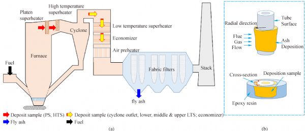 Recognizing the nature and formation progress of the ash deposits is essential to resolve the deposition problem hindering the wide application of large-scale biomass-fired boilers. Therefore, the ash deposits in the superheaters of a 220 t/h biomass-fired CFB boiler were studied, including the platen (PS), the high-temperature (HTS), the upper and the lower low-temperature superheaters (LTS). The results showed that the deposits in the PSs and HTSs were thin (several millimeters) and compact, consisting of a yellow outer layer and snow-white inner layer near the tube surface. The deposits in the upper LTS appeared to be toughly sintered ceramic, while those in the lower LTS were composed of dispersive coarse ash particles with an unsintered surface. Detailed characterization of the cross-section and the initial layers in the deposits revealed that the dominating compositions in both the PSs and the HTSs were Cl and K (approximately 70%) in the form of KCl. Interestingly, the cross-section of the deposition in the upper LTS exhibited a unique lamellar structure with a major composition of Ca and S. The contents of Ca and Si increased from approximately 10% to approximately 60% in the deposits from the high temperature surfaces to the low temperature ones. It was concluded that the vaporized mineral matter such as KCl played the most important role in the deposition progress in the PS and the HTS. In addition, although the condensation of KCl in the LTSs also happened, the deposition of ash particles played a more important role.