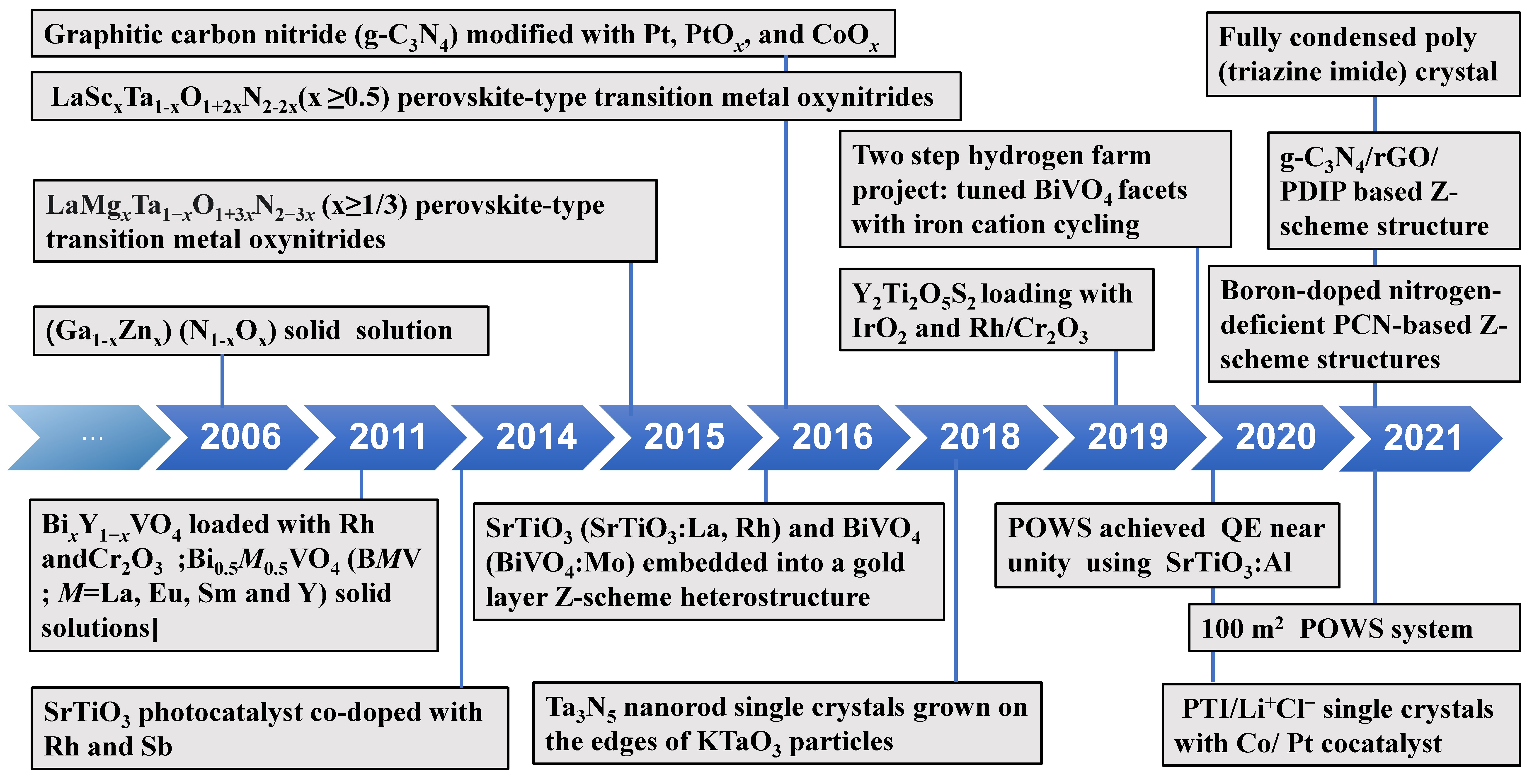 Solar energy-driven photocatalytic water splitting has been investigated for decades to produce clean and renewable green hydrogen. In this paper, the cutting-edge research within the overall water splitting system is summarized from the one-step photocatalytic overall water splitting (POWS) system to the two-step system and the cocatalysts research in this field. In addition, the photocatalytic reaction engineering study is also reviewed which is crucial for future scale-up. This mini-review provides a picture of survey of recent progress of relevant overall water splitting system, with particular attention paid to material system and mechanistic breakthroughs, and highlights the challenge and opportunity of the current system.