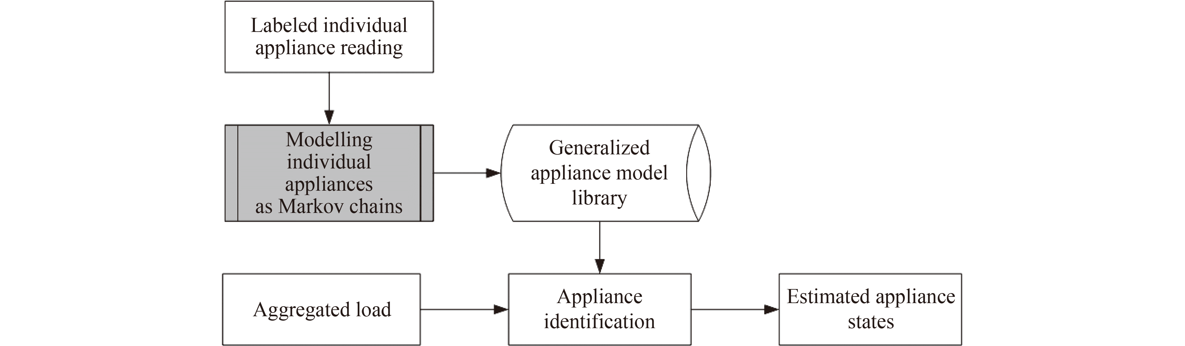 Nonintrusive load monitoring (NILM) is crucial for extracting patterns of electricity consumption of household appliance that can guide users’ behavior in using electricity while their privacy is respected. This study proposes an online method based on the transient behavior of individual appliances as well as system steady-state characteristics to estimate the operating states of the appliances. It determines the number of states for each appliance using the density-based spatial clustering of applications with noise (DBSCAN) method and models the transition relationship among different states. The states of the working appliances are identified from aggregated power signals using the Kalman filtering method in the factorial hidden Markov model (FHMM). Thereafter, the identified states are confirmed by the verification of system states, which are the combination of the working states of individual appliances. The verification step involves comparing the total measured power consumption with the total estimated power consumption. The use of transient features can achieve fast state inference and it is suitable for online load disaggregation. The proposed method was tested on a high-resolution data set such as Labeled hIgh-Frequency daTaset for Electricity Disaggregation (LIFTED) and it outperformed other related methods in the literature.