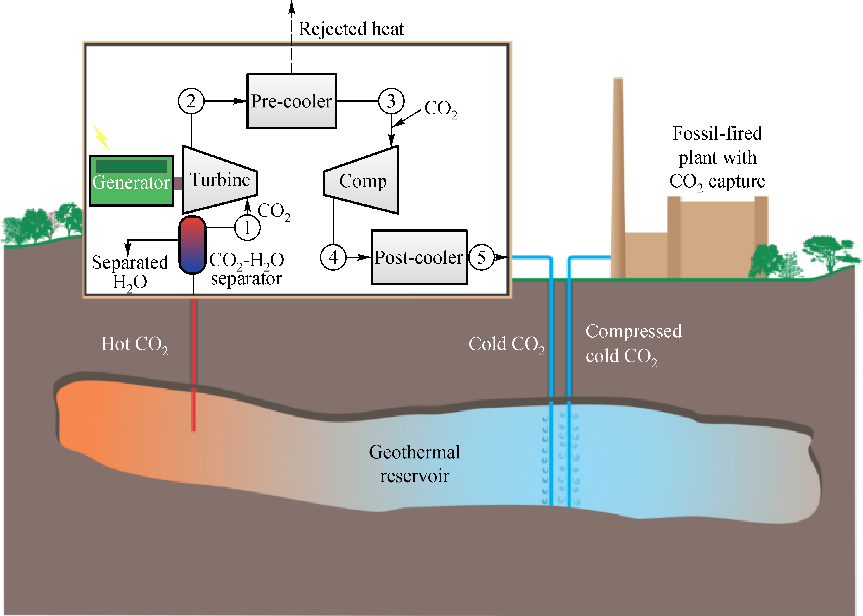 A comprehensive thermo-economic model combining a geothermal heat mining system and a direct supercritical CO2 turbine expansion electric power generation system was proposed in this paper. Assisted by this integrated model, thermo-economic and optimization analyses for the key design parameters of the whole system including the geothermal well pattern and operational conditions were performed to obtain a minimal levelized cost of electricity (LCOE). Specifically, in geothermal heat extraction simulation, an integrated wellbore-reservoir system model (T2Well/ECO2N) was used to generate a database for creating a fast, predictive, and compatible geothermal heat mining model by employing a response surface methodology. A parametric study was conducted to demonstrate the impact of turbine discharge pressure, injection and production well distance, CO2 injection flowrate, CO2 injection temperature, and monitored production well bottom pressure on LCOE, system thermal efficiency, and capital cost. It was found that for a 100 MWe power plant, a minimal LCOE of $0.177/kWh was achieved for a 20-year steady operation without considering CO2 sequestration credit. In addition, when CO2 sequestration credit is $1.00/t, an LCOE breakeven point compared to a conventional geothermal power plant is achieved and a breakpoint for generating electric power generation at no cost was achieved for a sequestration credit of $2.05/t.