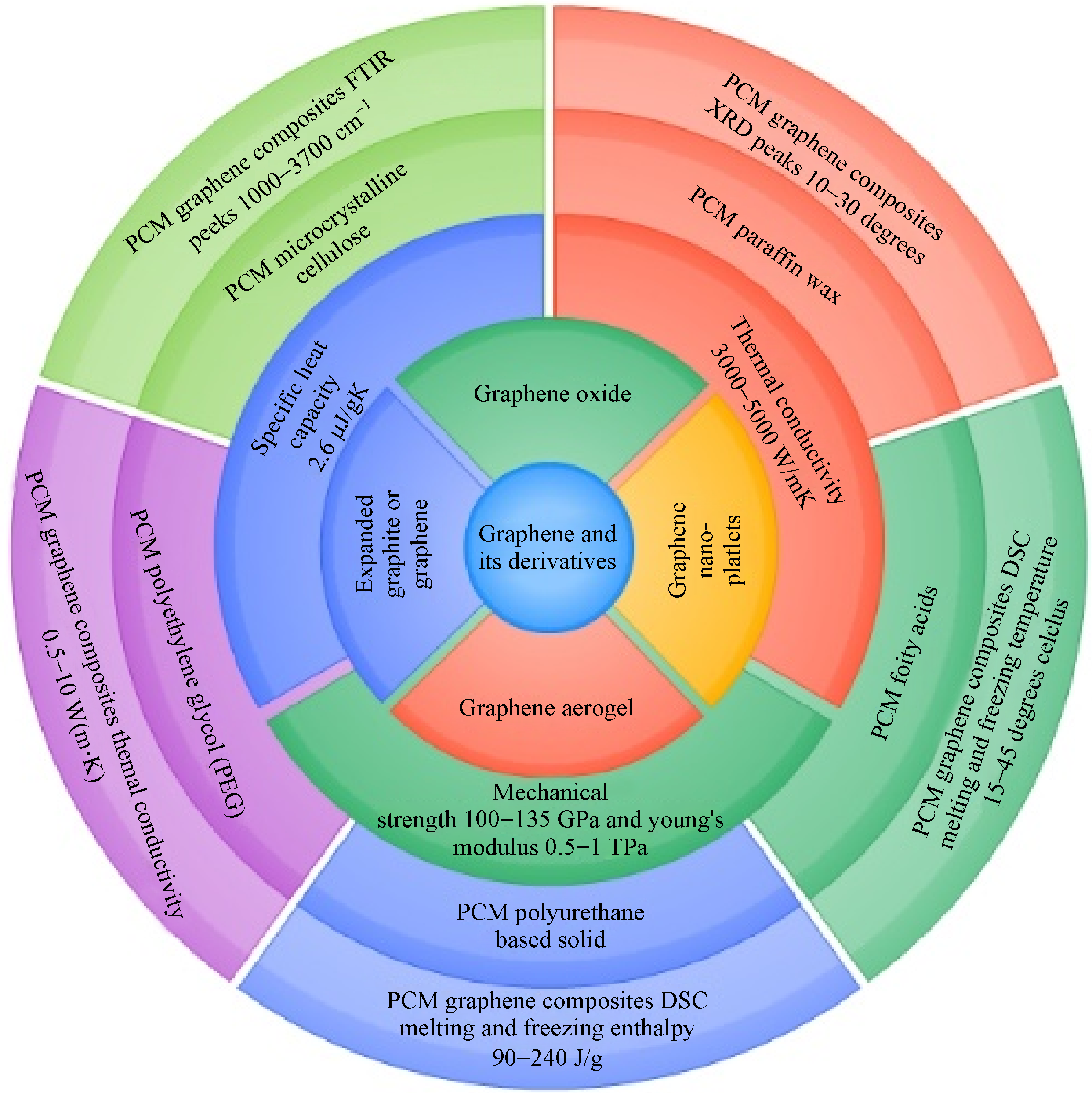 In this work, Gr and its derivatives based PCMs was characterized by Fourier transform infrared spectroscopy (FT-IR), X-ray diffraction spectroscopy (XRD), and scanning electron microscopy (SEM) by which crystal structure was known, phase was identified along with the knowledge of surface structure respectively. The increase in the mass fraction (%) of the filler (Gr and its derivatives) led to even better thermo-physical properties and thermal stability. The thermal characterization was also done by differential scanning calorimetry (DSC), thermo gravimetric analysis (TGA) and thermal conductivity tests. The enthalpy of freezing and melting showed that Gr and its derivatives based PCMs had a very high energy storage capability as reflected in its various applications.