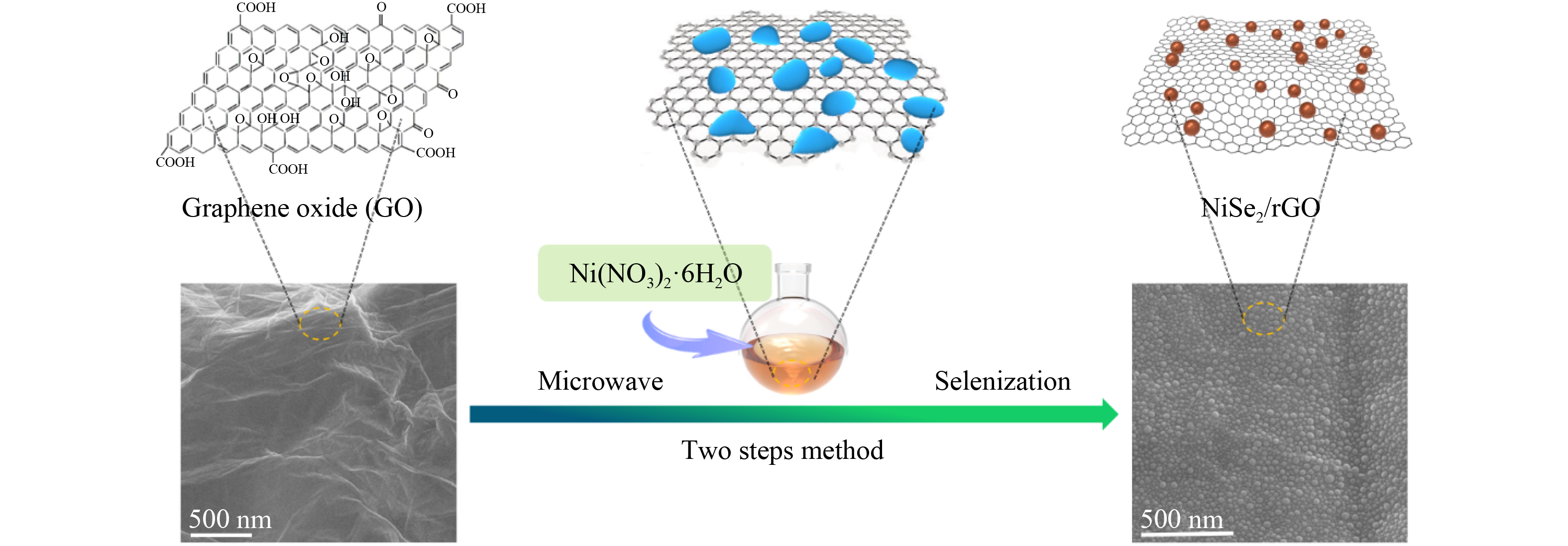 Nickel selenide electrocatalysts for hydrogen evolution reaction (HER) with a high efficiency and a low-cost have a significant potential in the development of water splitting. However, the inferiority of the high overpotential and poor stability restricts their practical applications. Herein, a composite nanostructure consists of ultrasmall NiSe2 nanocrystals embedded on graphene by microwave reaction is reported. The prepared NiSe2/reduced graphite oxide (rGO) electrocatalyst exhibited a high HER activity with an overpotential of 158 mV at a current density of 10 mA/cm2 and a corresponding moderate Tafel slope of 56 mV/dec in alkaline electrolyte. In addition, a high retention of electrochemical properties (approximately 100%) was demonstrated with an unchangeable microstructure after 100 h of continuous operation.