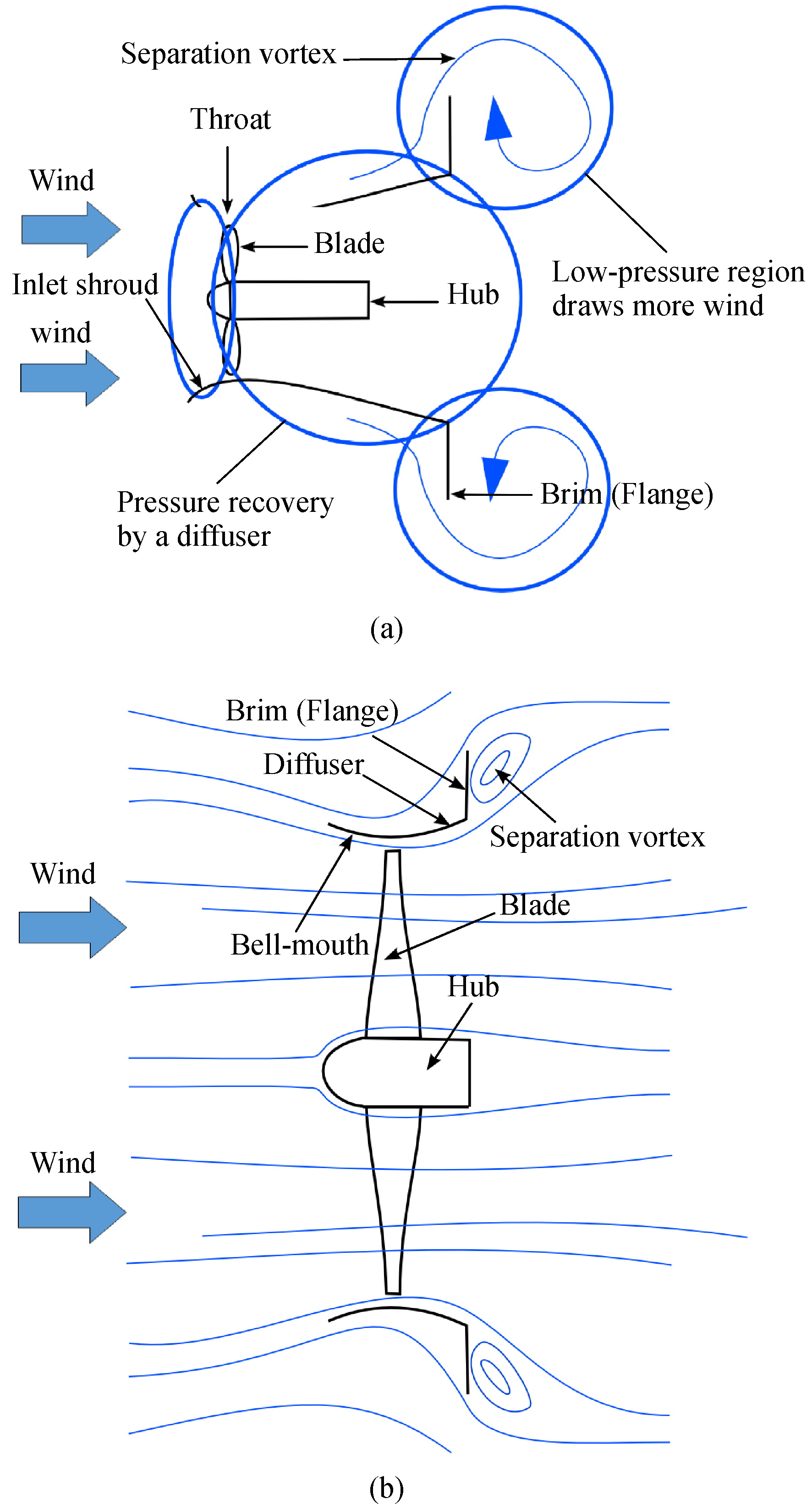 Wind-lens turbines (WLTs) exhibit the prospect of a higher output power and more suitability for urban areas in comparison to bare wind turbines. The wind-lens typically comprises a diffuser shroud coupled with a flange appended to the exit periphery of the shroud. Wind-lenses can boost the velocity of the incoming wind through the turbine rotor owing to the creation of a low-pressure zone downstream the flanged diffuser. In this paper, the aerodynamic performance of the wind-lens is computationally assessed using high-fidelity transient CFD simulations for shrouds with different profiles, aiming to assess the effect of change of some design parameters such as length, area ratio and flange height of the diffuser shroud on the power augmentation. The power coefficient (Cp) is calculated by solving the URANS equations with the aid of the SST k–ω model. Furthermore, comparisons with experimental data for validation are accomplished to prove that the proposed methodology could be able to precisely predict the aerodynamic behavior of the wind-lens turbine. The results affirm that wind-lens with cycloidal profile yield an augmentation of about 58% increase in power coefficient compared to bare wind turbine of the same rotor swept-area. It is also emphasized that diffusers (cycloid type) of small length could achieve a twice increase in power coefficient while maintaining large flange heights.