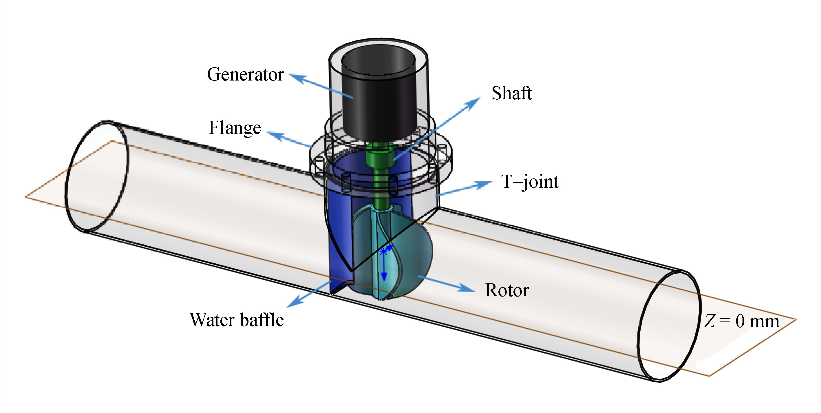 A series of inline pico hydropower systems, which could be used in confined space, especially for water distribution networks (WDNs), was designed and investigated. The turbine with an eye-shaped vertical water baffle was developed to evaluate the hydraulic performance. A three-dimensional dynamic mesh was employed and the inlet velocity was considered as the inlet boundary condition, whereas the outlet boundary was set as the outflow. Then, numerical simulations were conducted and the standard k-ε turbulence model was found to be the best capable of predicting flow features through the comparison with the experimental results. The effects of the opening diameter of the water baffle and installation angle of the rotor on the flow field in the turbine were investigated. The results suggested that the water baffle opening at d = 30 mm and the rotor at a 52° angle could achieve the highest efficiency of 5.93%. The proper eye-shaped baffle not only accelerates the fluid flow and generates positive hydrodynamic torque, but also eliminates the flow separation. The scheme proposed in this paper can be exploited for practical applications in the water pipelines at various conditions and power requirements.