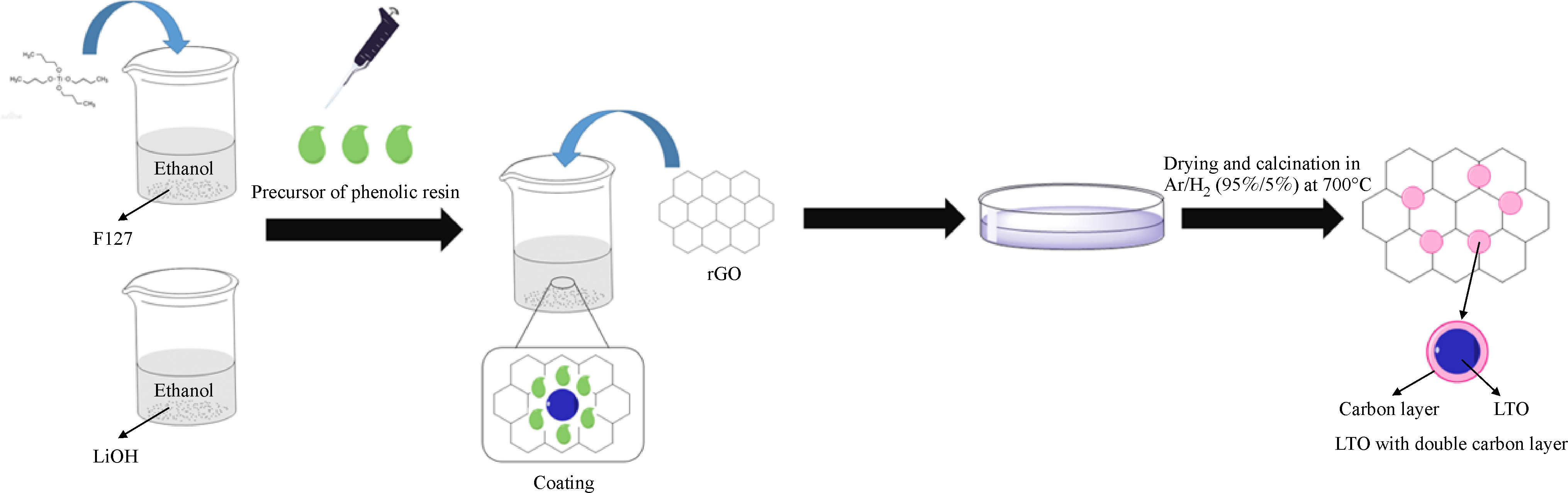 In this paper, a facile strategy is proposed to controllably synthesize mesoporous Li4Ti5O12/C nanocomposite embedded in graphene matrix as lithium-ion battery anode via the co-assembly of Li4Ti5O12 (LTO) precursor, GO, and phenolic resin. The obtained composites, which consists of a LTO core, a phenolic-resin-based carbon shell, and a porous frame constructed by rGO, can be denoted as LTO/C/rGO and presents a hierarchical structure. Owing to the advantages of the hierarchical structure, including a high surface area and a high electric conductivity, the mesoporous LTO/C/rGO composite exhibits a greatly improved rate capability as the anode material in contrast to the conventional LTO electrode.