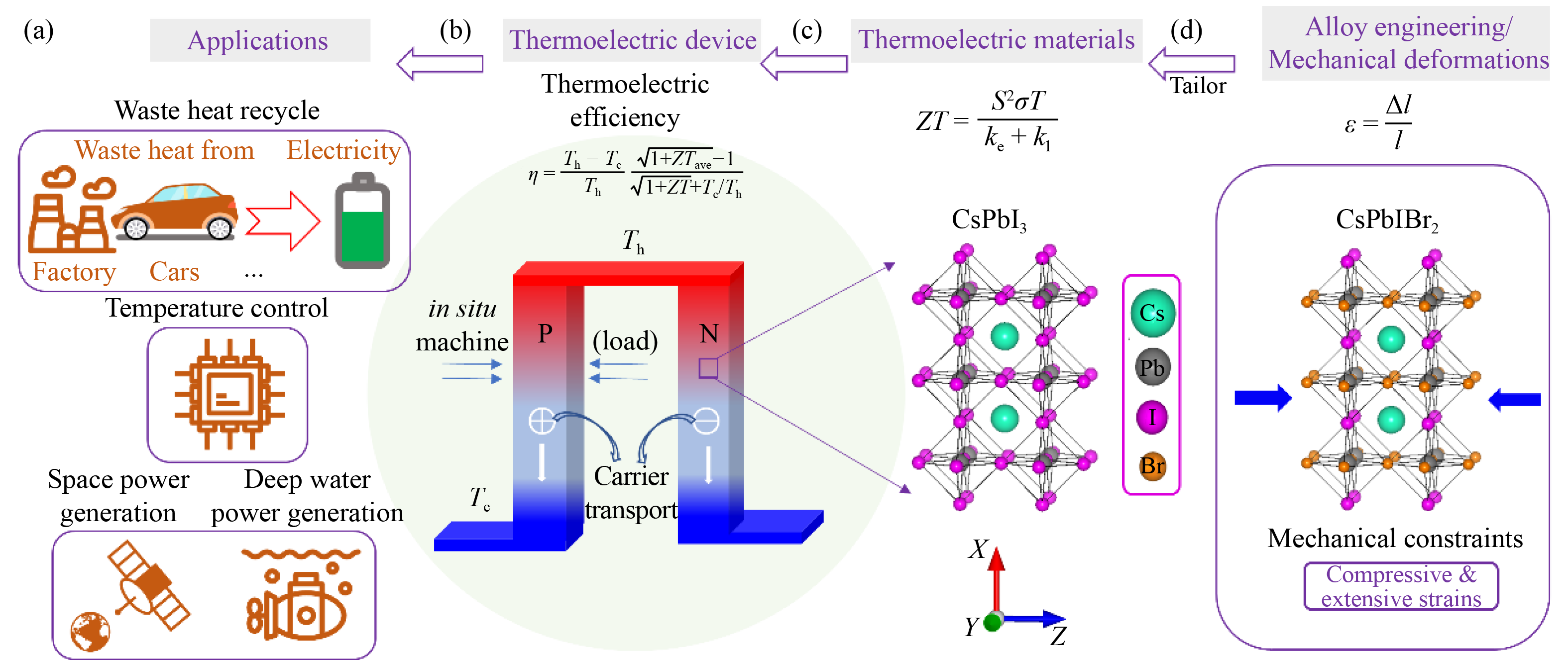 Solid-state thermoelectric energy conversion devices attract broad research interests because of their great promises in waste heat recycling, space power generation, deep water power generation, and temperature control, but the search for essential thermoelectric materials with high performance still remains a great challenge. As an emerging low cost, solution-processed thermoelectric material, inorganic metal halide perovskites CsPb(I1–xBrx)3 under mechanical deformation is systematically investigated using the first-principle calculations and the Boltzmann transport theory. It is demonstrated that halogen mixing and mechanical deformation are efficient methods to tailor electronic structures and charge transport properties in CsPb(I1–xBrx)3 synergistically. Halogen mixing leads to band splitting and anisotropic charge transport due to symmetry-breaking-induced intrinsic strains. Such band splitting reconstructs the band edge and can decrease the charge carrier effective mass, leading to excellent charge transport properties. Mechanical deformation can further push the orbital energies apart from each other in a more controllable manner, surpassing the impact from intrinsic strains. Both anisotropic charge transport properties andZT values are sensitive to the direction and magnitude of strain, showing a wide range of variation from 20% to 400% (with a ZT value of up to 1.85) compared with unstrained cases. The power generation efficiency of the thermoelectric device can reach as high as approximately 12% using mixed halide perovskites under tailored mechanical deformation when the heat-source is at 500 K and the cold side is maintained at 300 K, surpassing the performance of many existing bulk thermoelectric materials.