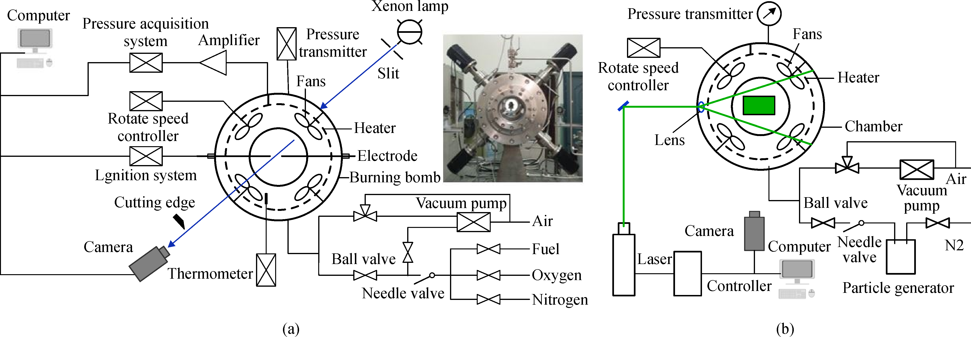 A fan-stirred combustion chamber is deve-loped for spherically expanding flames, with P and T up to 10 bar and 473 K, respectively. Turbulence characteristics are estimated using particle image velocimetry (PIV) at different initial pressures (P = 0.5–5 bar), fan frequencies (ω = 0–2000 r/min), and impeller diameters (D = 100 and 114 mm). The flame propagation of methanol/air is investigated at different turbulence intensities (u′=0–1.77 m/s) and equivalence ratios (φ = 0.7–1.5). The results show that u′ is independent of P and proportional to ω, which can be up to 3.5 m/s at 2000 r/min. LT is independent of P and performs a power regression with ω approximately. The turbulent field is homogeneous and isotropic in the central region of the chamber while the inertial subrange of spatial energy spectrum is more collapsed to –5/3 law at a high ReT. Compared to laminar expanding flames, the morpho-logy of turbulent expanding flames is wrinkled and the wrinkles will be finer with the growth of turbulence intensity, consistent with the decline of the Taylor scale and the Kolmogorov scale. The determined SL in the present study is in good agreement with that of previous literature. The SL and ST of methanol/air have a non-monotonic trend with φ while peak ST is shifted to the richer side compared to SL. This indicates that the newly built turbulent combustion chamber is reliable for further experimental study.
