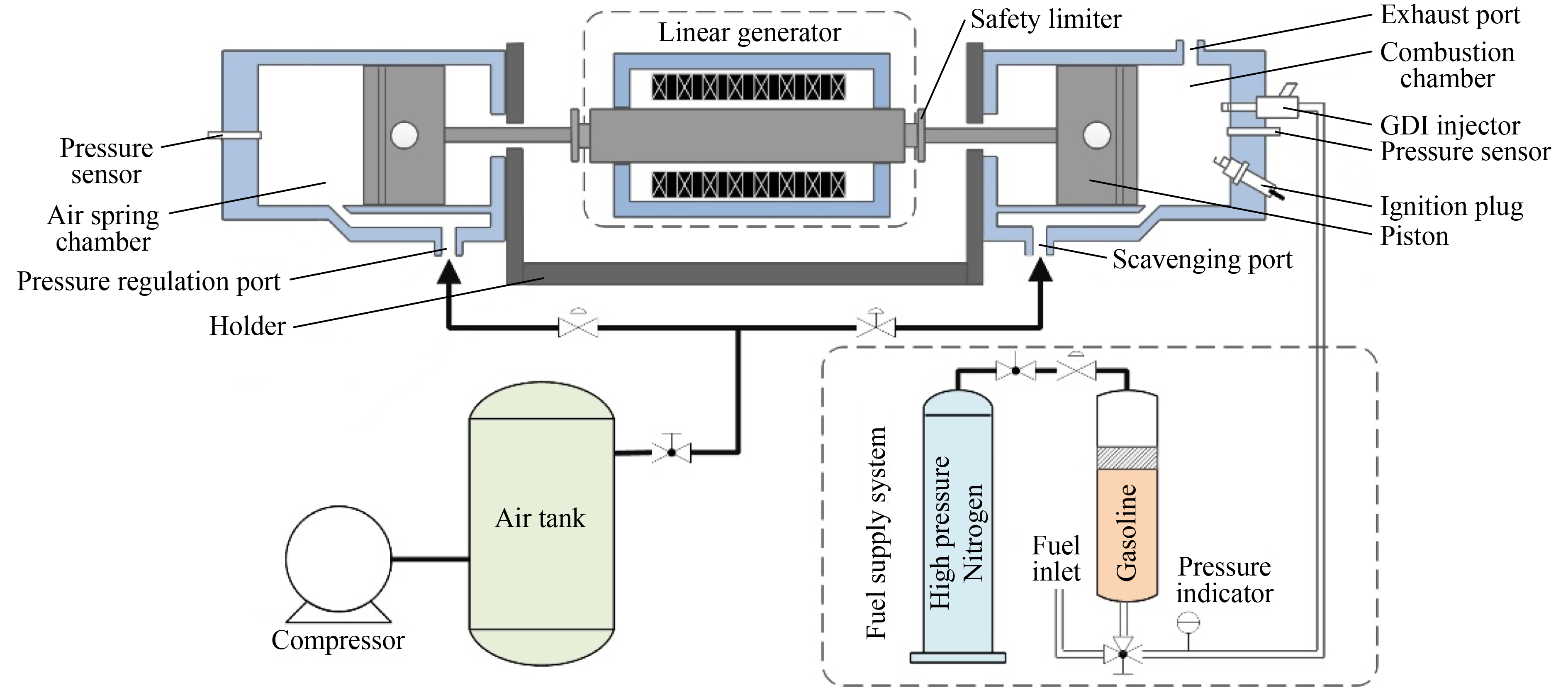 Free piston linear generator (FPLG) is a promising range extender for the electrical vehicle with unparallel advantages, such as compact structure, higher system efficiency, and reduced maintenance cost. However, due to the lack of the mechanic crankshaft, the related piston motion control is a challenge for the FPLG which causes problems such as misfire and crash and limits its widespread commercialization. Aimed at resolving the problems as misfire, a single-piston FPLG prototype has been designed and manufactured at Shanghai Jiao Tong University (SJTU). In this paper, the development process and experimental validation of the related control strategies were detailed. From the experimental studies, significant misfires were observed at first, while the FPLG operated in natural-aspiration conditions. The root cause of this misfire was then identified as the poor scavenging process, and a compressed air source was leveraged to enhance the related scavenging pressure. Afterward, optimal control parameters, in terms of scavenging pressure, air-fuel equivalence ratio, and ignition position, were then calibrated in this charged-scavenging condition. Eventually, the FPLG prototype has achieved a continuous stable operation of over 1000 cycles with an ignition rate of 100% and a cycle-to-cycle variation of less than 0.8%, produced an indicated power of 2.8 kW with an indicated thermal efficiency of 26% and an electrical power of 2.5 kW with an overall efficiency of 23.2%.