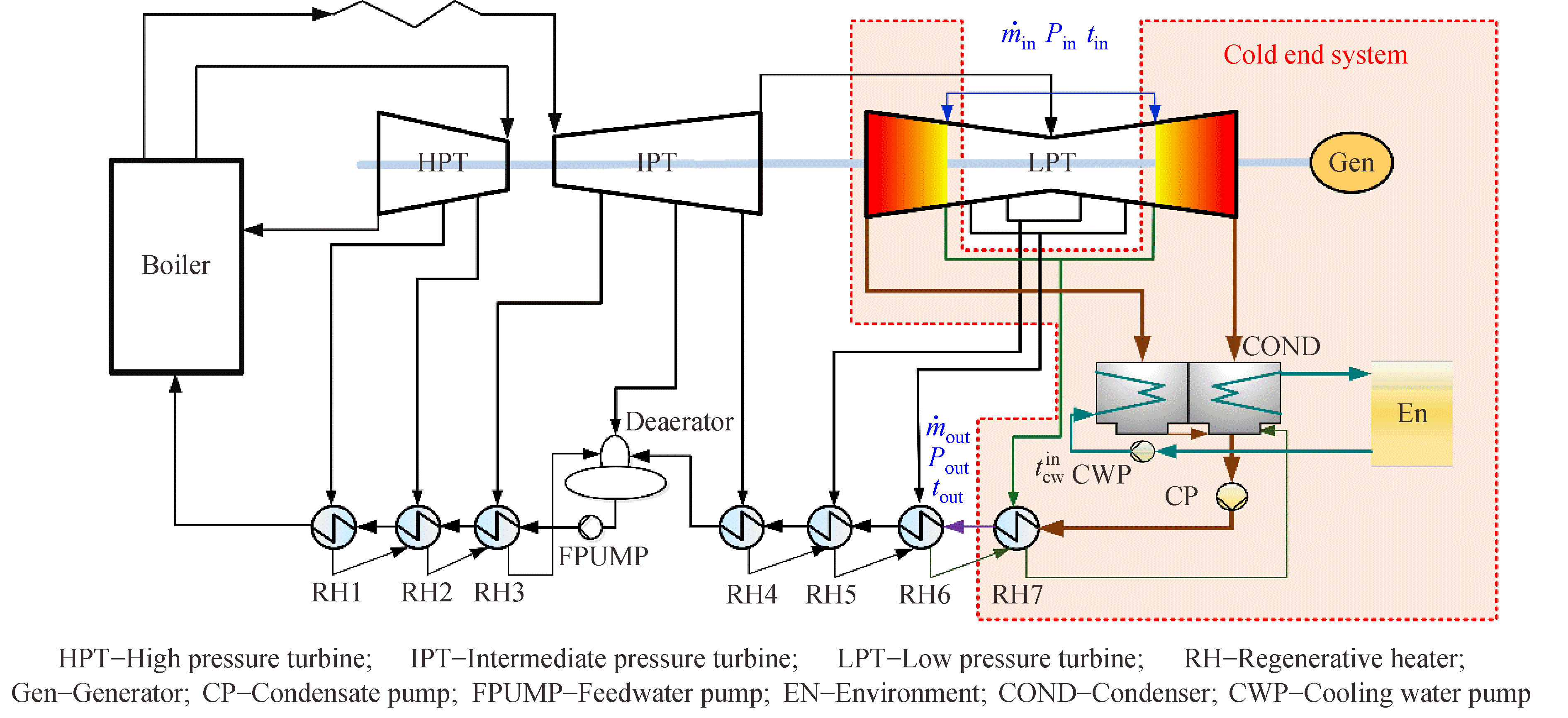 Cold-end systems are heat sinks of thermal power cycles, which have an essential effect on the overall performance of thermal power plants. To enhance the efficiency of thermal power plants, multi-pressure condensers have been applied in some large-capacity thermal power plants. However, little attention has been paid to the optimization of the cold-end system with multi-pressure condensers which have multiple parameters to be identified. Therefore, the design optimization methods of cold-end systems with single- and multi-pressure condensers are developed based on the entropy generation rate, and the genetic algorithm (GA) is used to optimize multiple parameters. Multiple parameters, including heat transfer area of multi-pressure condensers, steam distribution in condensers, and cooling water mass flow rate, are optimized while considering detailed entropy generation rate of the cold-end systems. The results show that the entropy generation rate of the multi-pressure cold-end system is less than that of the single-pressure cold-end system when the total condenser area is constant. Moreover, the economic performance can be improved with the adoption of the multi-pressure cold-end system. When compared with the single-pressure cold-end system, the excess revenues gained by using dual- and quadruple-pressure cold-end systems are 575 and 580 k$/a, respectively.