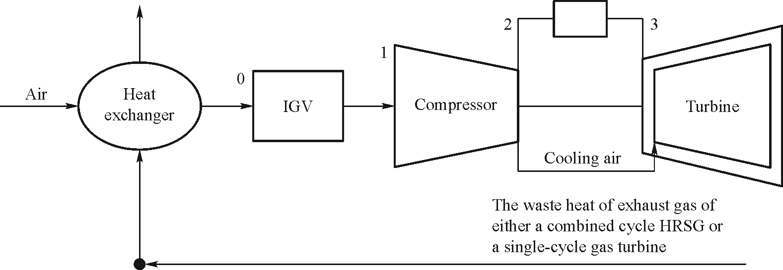A novel adjusting method for improving gas turbine (GT) efficiency and surge margin (SM) under part-load conditions is proposed. This method adopts the inlet air heating technology, which uses the waste heat of low-grade heat source and the inlet guide vane (IGV) opening adjustment. Moreover, the regulation rules of the compressor inlet air temperature and the IGV opening are studied comprehensively to optimize GT performance. A model and calculation method for an equilibrium running line is adopted based on the characteristic curves of the compressor and turbine. The equilibrium running lines calculated through the calculation method involve three part-load conditions and three IGV openings with different inlet air temperatures. The results show that there is an optimal matching relationship between IGV opening and inlet air temperature. For the best GT performance of a given load, the IGV could be adjusted according to inlet air temperature. In addition, inlet air heating has a considerable potential for the improvement of part-load performance of GT due to the increase in compressor efficiency, combustion efficiency, and turbine efficiency as well as turbine inlet temperature, when inlet air temperature is lower than the optimal value with different IGV openings. Further, when the IGV is in a full opening state and an optimal inlet air temperature is achieved by using the inlet air heating technology, GT efficiency and SM can be obviously higher than other IGV openings. The IGV can be left unadjusted, even when the load is as low as 50%. These findings indicate that inlet air heating has a great potential to replace the IGV to regulate load because GT efficiency and SM can be remarkably improved, which is different from the traditional viewpoints.
