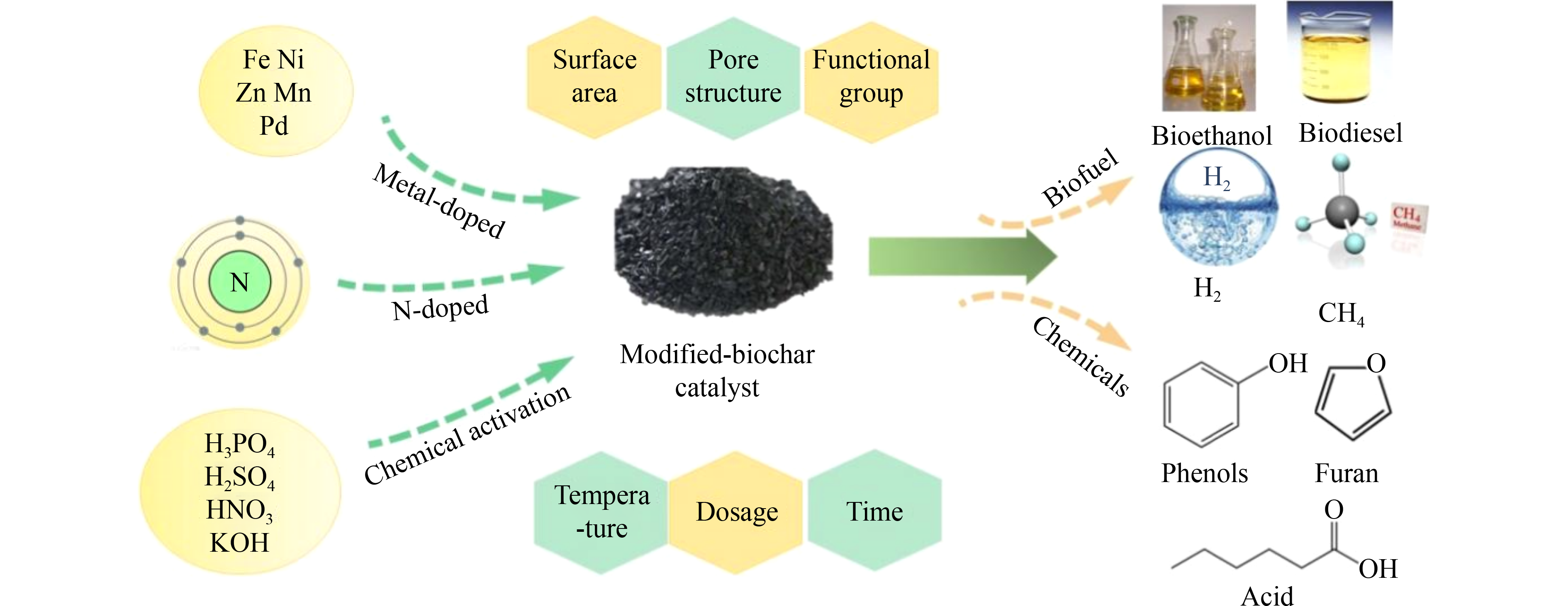 The reuse of biomass wastes is crucial toward today’s energy and environmental crisis, among which, biomass-based biochar as catalysts for biofuel and high value chemical production is one of the most clean and economical solutions. In this paper, the recent advances in biofuels and high chemicals for selective production based on biochar catalysts from different biomass wastes are critically summarized. The topics mainly include the modification of biochar catalysts, the preparation of energy products, and the mechanisms of other high-value products. Suitable biochar catalysts can enhance the yield of biofuels and higher-value chemicals. Especially, the feedstock and reaction conditions of biochar catalyst, which affect the efficiency of energy products, have been the focus of recent attentions. Mechanism studies based on biochar catalysts will be helpful to the controlled products. Therefore, the design and advancement of the biochar catalyst based on mechanism research will be beneficial to increase biofuels and the conversion efficiency of chemicals into biomass. The advanced design of biochar catalysts and optimization of operational conditions based on the biomass properties are vital for the selective production of high-value chemicals and biofuels. This paper identifies the latest preparation for energy products and other high-value chemicals based on biochar catalysts progresses and offers insights into improving the yield of high selectivity for products as well as the high recyclability and low toxicity to the environment in future applications.
