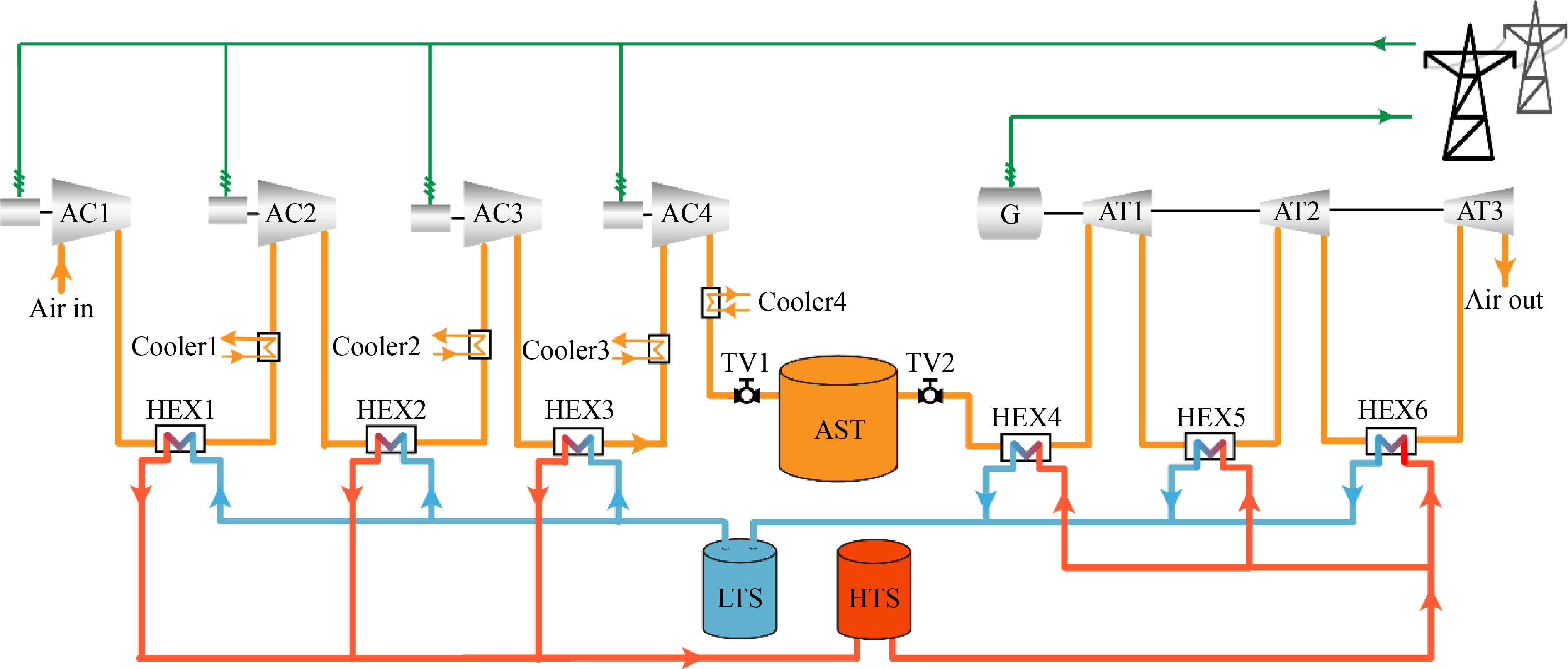 Carbon dioxide energy storage (CES) is an emerging compressed gas energy storage technology which offers high energy storage efficiency, flexibility in location, and low overall costs. This study focuses on a CES system that incorporates a high-temperature graded heat storage structure, utilizing multiple heat exchange working fluids. Unlike traditional CES systems that utilize a single thermal storage at low to medium temperatures, this system significantly optimizes the heat transfer performance of the system, thereby improving its cycle efficiency. Under typical design conditions, the round-trip efficiency of the system is found to be 76.4%, with an output power of 334 kW/(kg·s‒1) per unit mass flow rate, through mathematical modeling. Performance analysis shows that increasing the total pressure ratio, reducing the heat transfer temperature difference, improving the heat exchanger efficiency, and lowering the ambient temperature can enhance cycle efficiency. Additionally, this paper proposes a universal and theoretical CES thermodynamic intrinsic cycle construction method and performance prediction evaluation method for CES systems, providing a more standardized and accurate approach for optimizing CES system design.