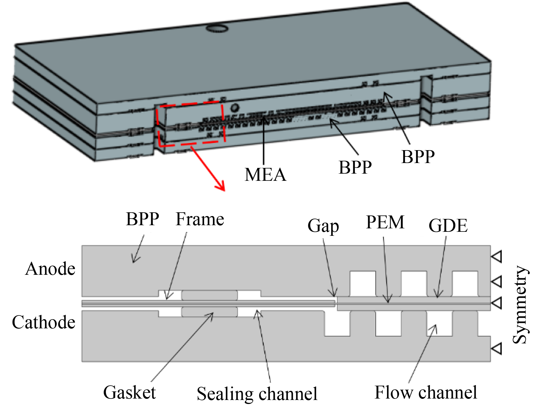 The frame of membrane electrode assembly (MEA) influences the durability of proton exchange membrane fuel cell (PEMFC). In this paper, the thermal shock bench was applied as an accelerated aging test to explore the effect of frame sealing structure on MEA durability at different temperatures. Analysis of scanning electron microscope (SEM) images reveals that thermal shock results in the formation of cracks on the exposed proton exchange membrane (PEM) at the gap between the frame and the active area. Moreover, it breaks the bonding interface between the frame and the membrane and leads to the debonding of the adhesive, which exacerbates the risk of crossover of the reactant gas. A comparison of the single-layer and improved double-layer frame structures reveal that the mechanical damage is caused by frequent membrane wrinkles in the gap under temperature shock. However, addition of a cushion layer improves the continuity between the frame and the active area, and reduces deformation of the membrane, thereby preventing membrane damage.