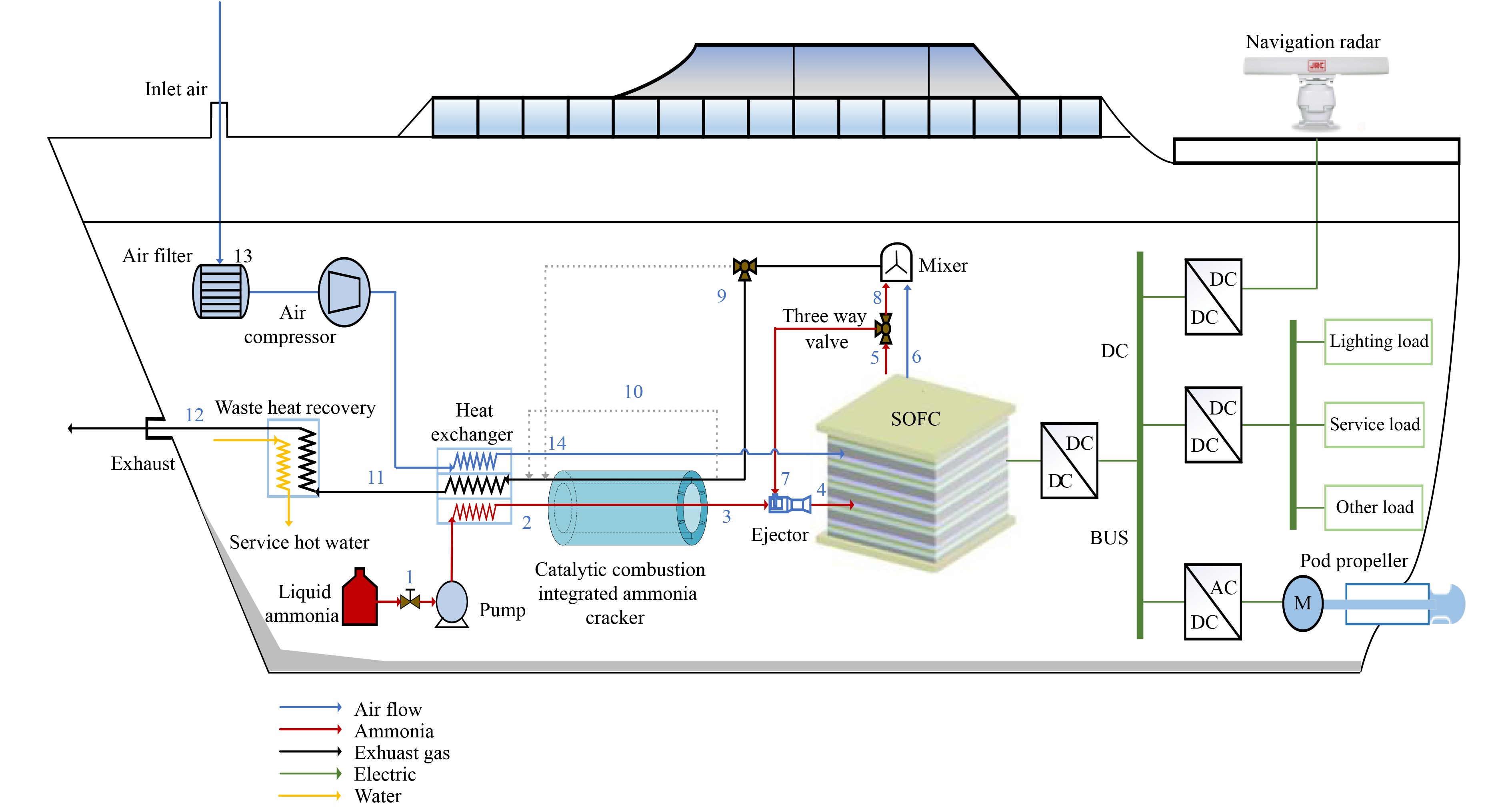 The solid oxide fuel cell (SOFC) power system fueled by NH3 is considered one of the most promising solutions for achieving ship decarbonization and carbon neutrality. This paper addresses the technical challenges faced by NH3 fuel SOFC ship power system, including slow hydrogen (H2) production, low efficiency, and limited space. It introduces an innovative a NH3-integrated reactor for rapid H2 production, establishes a safe and efficient all-electric SOFC all-electric propulsion system adaptable to various sailing conditions. The system is validated using a 2 kW prototype experimental rig. Results show that the SOFC system, designed for a target ship, has a rated power of 96 kW and an electrical efficiency of 60.13%, meeting the requirements for rated cruising conditions. Under identical catalytic scenarios, the designed reactor, with highly efficient heat transfer, measuring 1.1 m in length, can achieve complete NH3 decomposition within 2.94 s, representing a 35% reduction in cracking time and a 42% decrease in required cabin space. During high-load voyage conditions, adjusting the circulation ratio (CR) and ammonia-oxygen ratio (A/O) improves system efficiency across a wide operational range. Among these adjustments, altering the A/O ratio proves to be the most efficient strategy. Under this configuration, the system achieves an efficiency of 55.02% at low load and 61.73% at high load, allowing operation across a power range of 20% to 110%. Experimental results indicate that the error for NH3 cracking H2 is less than 3% within the range of 570–700 °C, which is relevant to typical ship operation scenarios. At 656 °C, the NH3 cracking H2 rate reaches 100%. Under these conditions, the SOFC produces 2.045 kW of power with an efficiency of approximately 58.66%. The noise level detected is 58.6 dB, while the concentrations of CO2, NO, and SO2 in the flue gas approach zero. These findings support the transition of the shipping industry to green, clean systems, contributing significantly to future reductions in ocean carbon emissions.