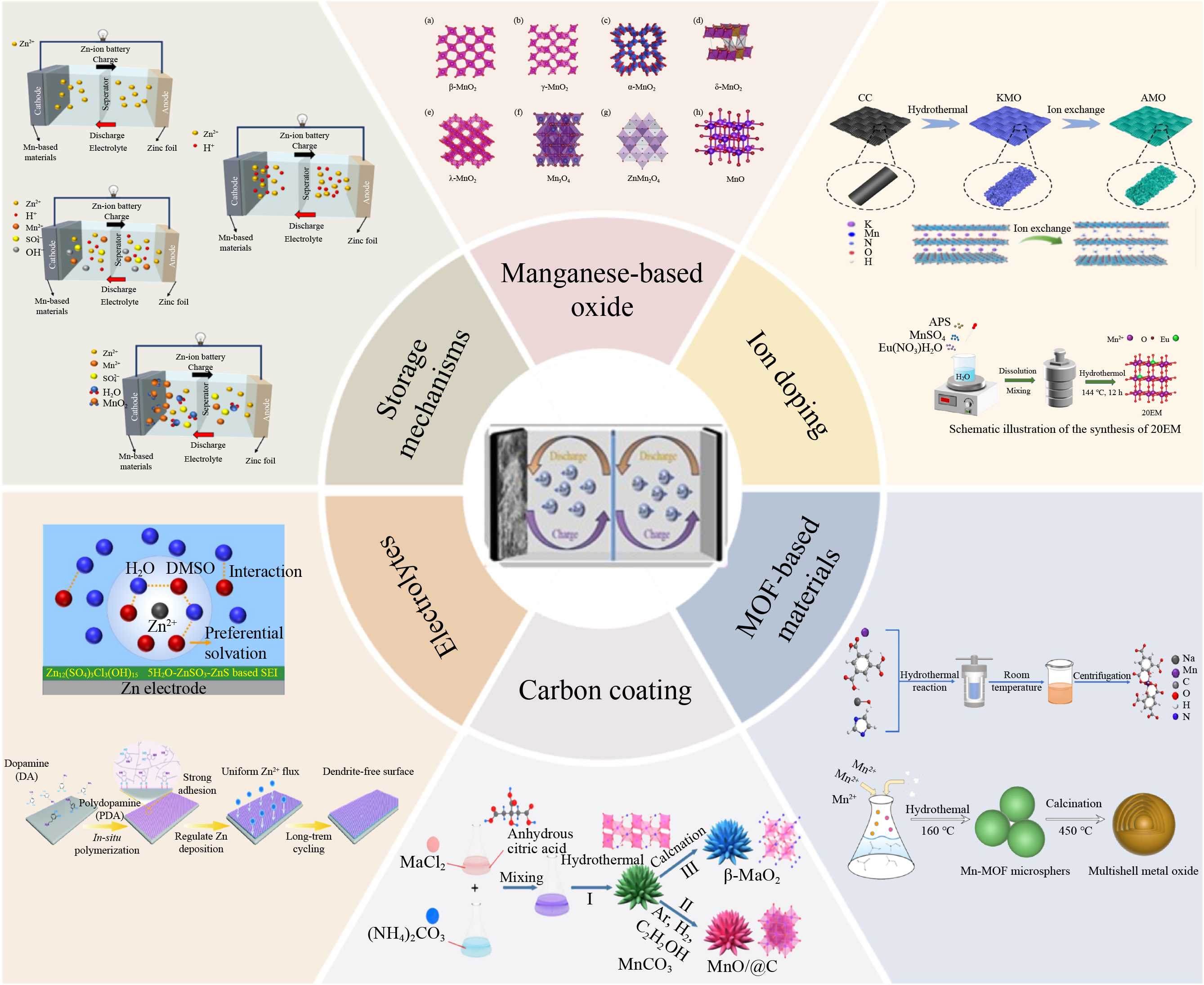 Aqueous zinc-ion batteries (AZIBs) are emerging as a promising option for next-generation energy storage due to their abundant resources, affordability, eco-friendliness, and high safety levels. Manganese-based cathode materials, in particular, have garnered significant attention because of their high theoretical capacity and cost-effectiveness. However, they still face substantial challenges related to rate performance and cycling stability. To address these issues, researchers have developed various strategies. This review focuses on the key advancements in manganese-based cathode materials for AZIBs in recent years. It begins with a detailed analysis of the energy storage mechanisms in manganese-based cathodes. Next, it introduces a variety of manganese-based oxides, highlighting their distinct crystal structures and morphologies. It also outlines optimization strategies, such as ion doping (both monovalent ions and multivalent ions), the preparation of Mn-based metal-organic frameworks (MOFs), carbon materials coatings, and electrolyte optimization. These strategies have significantly improved the electrochemical performance of manganese-based oxide cathodes. By systematically analyzing these advancements, it aims to provide guidance for the development of high-performance manganese-based cathodes. Finally, it discusses prospective research directions for manganese-based cathodes in AZIBs.