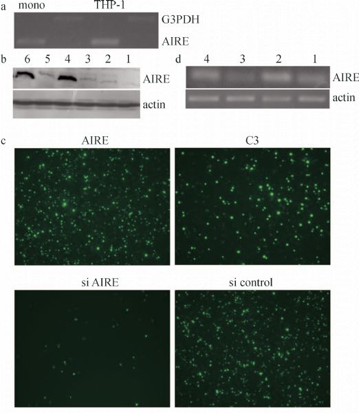 The autoimmune regulator (AIRE) is a crucial factor for the induction of central tolerance, and mutations in this gene lead to abnormal immune responses. However, the role of AIRE in autophagy in immune cells, especially in monocytes, is obscure. In the present study, we found that overexpression of AIRE in THP-1 human monocytes resulted in increased endogenous light chain 3 (LC3)-II level and elevated LC3 positive vesicles. Moreover, an autophagy inhibitor or knockdown of AIRE by small interference RNA attenuated these effects. In contrast, the expression of p62/SQSTM1 remained unchanged in THP-1 cells after the corresponding treatment. Our findings indicate that AIRE plays a role in the regulation of autophagy in THP-1 human monocytes.
