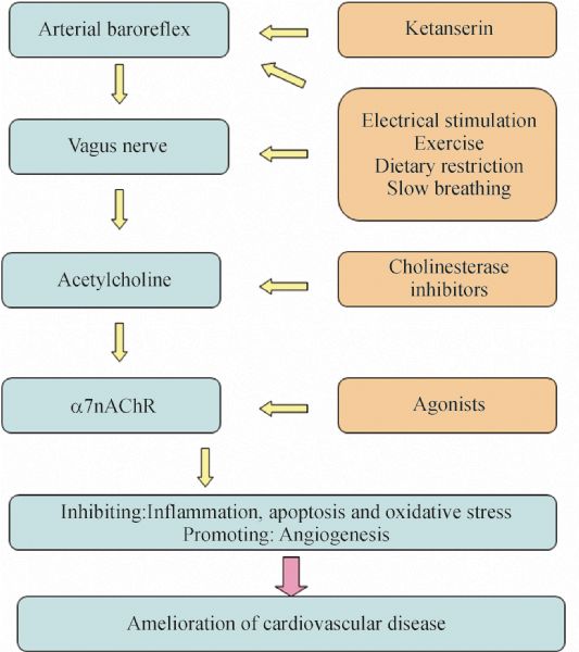 Inflammation is important in the pathogenesis and development of cardiovascular diseases. Recent studies show that vagus nerve stimulation inhibits pro-inflammatory cytokine production through “the cholinergic anti-inflammatory pathway,” more specifically via the α7 nicotinic acetylcholine receptor (α7nAChR). In the current study, the role of the cholinergic anti-inflammatory pathway during septic shock, hypertension, and myocardial infarction is reviewed, and its possible clinical implications in cardiovascular diseases are discussed.