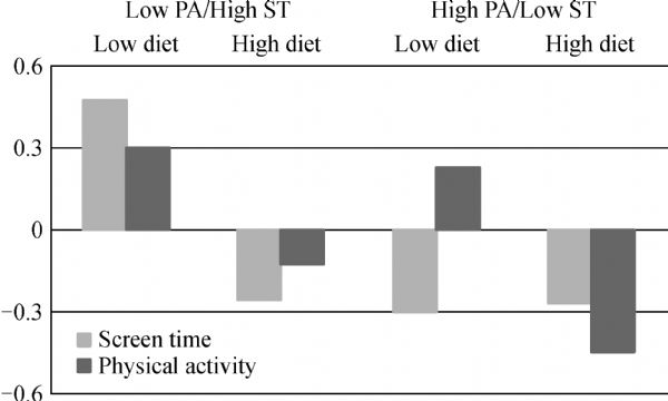 The increasing prevalence of childhood overweight and obesity has been associated with an increased risk for cardiovascular disease (CVD). While several studies examined the effect of single behaviors such as physical activity (PA), sedentary behavior or diet on CVD risk, there is a lack of research on combined associations, specifically in children. Therefore, the purpose of this study was to examine the joint association of PA or screen time (ST) and diet on CVD risk factors in children. PA, ST and diet were assessed via questionnaire in 210 fifth grade students (age: 10.6±0.4 years). The healthy eating index (HEI) was subsequently calculated as indicator for diet quality. Height, weight, % body fat, and resting blood pressure were measured according to standard procedures and blood samples obtained via fingerprick were assayed for blood lipids. Total cholesterol HDL ratio (TC:HDL), mean arterial pressure (MAP), and % body fat were used as indicators of CVD risk. 55% of children did not meet current PA recommendations on at least 5 days/week and 70% exceeded current recommendations for ST. Further, only 2.5% possessed a “good” diet (HEI>80). There was no significant association of PA or ST and diet on CVD risk score. Neither TC:HDL, MAP, and % body fat nor the total CVD risk score was significantly correlated with diet, PA, or ST. Children in the high PA group, however, had significantly better diet scores. Despite the fact that self-reported PA, ST, or dietary intake were not directly related to CVD risk in this sample, higher activity levels were associated with a healthier diet and lower ST indicating an overall healthier lifestyle of this subgroup.