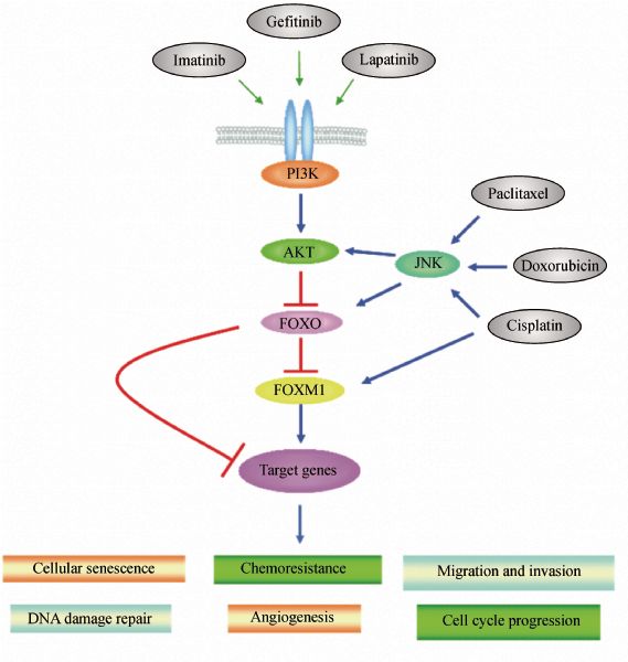 The forkhead transcription factors FOXO and FOXM1 have pivotal roles in tumorigenesis and in mediating chemotherapy sensitivity and resistance. Recent research shows that the forkhead transcription factor FOXM1 is a direct transcriptional target repressed by the forkhead protein FOXO3a, a vital downstream effector of the PI3K-AKT-FOXO signaling pathway. Intriguingly, FOXM1 and FOXO3a also compete for binding to the same gene targets, which have a role in chemotherapeutic drug action and sensitivity. An understanding of the role and regulation of the FOXO-FOXM1 axis will impact directly on our knowledge of chemotherapeutic drug action and resistance in patients, and provide new insights into the design of novel therapeutic strategy and reliable biomarkers for prediction of drug sensitivity.