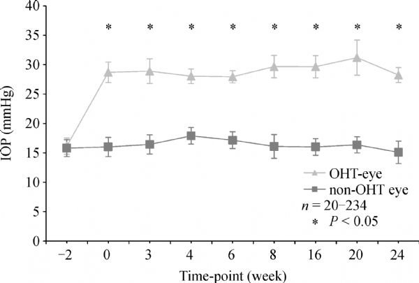 This study aimed to modify a chronic ocular hypertension (OHT) rat model to screen for potential compounds to protect retinal ganglion cells (RGCs) from responding to increased intraocular pressure (IOP). A total of 266 rats were prepared and randomly grouped according to different time-points, namely, weeks 3, 8, 16, and 24. Rats were sedated and eye examination was performed to score as the corneal damage on a scale of 1 to 4. The OHT rat model was created via the injection of a hypertonic saline solution into the episcleral veins once weekly for two weeks. OHT was identified when the IOP at week 0 was≥6 mmHg than that at week -2 for the same eye. Viable RGCs were labeled by injecting 4% FluoroGold. Rats were sacrificed, and the eyes were enucleated and fixed. The fixed retinas were dissected to prepare flat whole-mounts. The viable RGCs were visualized and imaged. The IOP (meanβ±βSD) was calculated, and data were analyzed by the paired t-test and one-way ANOVA. The OHT model was created in 234 of 266 rats (87.97%), whereas 32 rats (12.03%) were removed from the study because of the absence of IOP elevation (11.28%) and/or corneal damage scores over 4 (0.75%). IOP was elevated by as much as 81.35% for 24 weeks. The average IOP was (16.68β±β0.98)βmmHg in non-OHT eyes (n = 234), but was (27.95±0.97)βmmHg in OHT eyes (n = 234). Viable RGCs in the OHT eyes were significantly decreased in a time-dependent manner by 29.41%, 38.24%, 55.32%, and 59.30% at weeks 3, 8, 16, and 24, respectively, as compared to viable RGCs in the non-OHT eyes (P<β0.05). The OHT model was successfully created in 88% of the rats. The IOP in the OHT eyes was elevated by approximately 81% for 24 weeks. The number of viable RGCs was decreased by 59% of the rats in a time-dependent manner. The modified OHT model may provide an effective and reliable method for screening drugs to protect RGCs from glaucoma.
